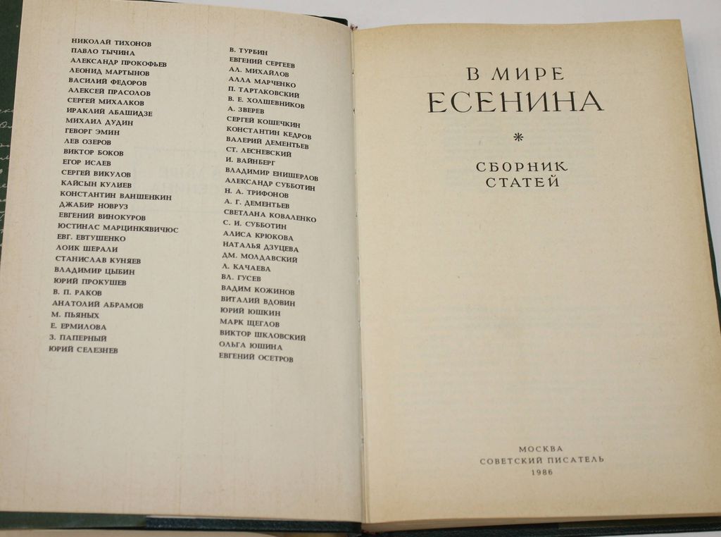 В мире Есенина. Сборник статей. М.: Советский писатель. 1986г. 654с. Сборник подготовлен Литературным институтом им. А. М. Горького Союза писателей СССР к 90-летию со дня рождения поэта. В него включены исследовательские статьи, а также воспоминания: Н. Тихонова, П. Тычины, А. Прокофьева, С. Михалкова, К. Вашенкина, Е. Евтушенко и др. о Сергее Есенине и его окружении. Твердый переплет. Суперобложка. Увеличенный формат. Хорошее состояние, суперобл. с надрывами.