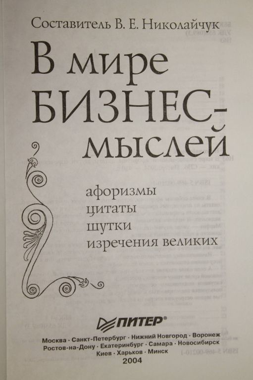 В мире бизнес-мыслей. Афоризмы, цитаты, шутки, изречения великих. Автор-сост. В.Е.Николайчук. СПб.: Питер. 2004г. 480 с. В книге собраны афоризмы, остроумные изречения известных людей, цитаты из популярных произведений - все, относящееся к таким сферам деятельности современного человека, как финансы, бизнес, маркетинг, менеджмент. В издание включены отрывки из книги Артура Блоха `Закон Мерфи` - свода научно-технического и управленческого фольклора, поданного в виде шутливых законов. Подарите эту книгу начальнику - и возможно, сами того не подозревая, вы внесете в корпоративные отношения чуточку легкости и юмора. Начинающему предпринимателю не вредно будет узнать, что и к бизнесу можно относиться с долей здоровой иронии. А если наше издание для кого-то станет настольной книгой, то успех в деловой среде этому человеку обеспечен - люди, умеющие в критической ситуации подходящим остроумным изречением разрядить обстановку, пользуются популярностью в наше время. А в этой книге собраны `золотые зерна` остроумия как раз на все случаи деловой жизни. Твердый переплет. Увеличенный формат. Очень хорошее состояние.