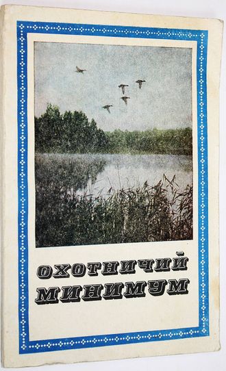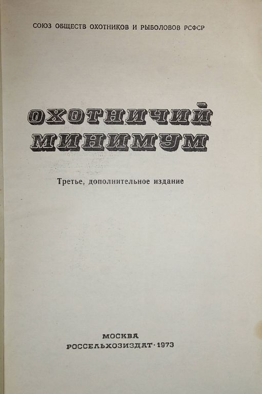 Охотничий минимум. Союз обществ охотников и рыболовов РСФСР. Третье, дополнительное издание. М.: Россельхозиздат. 1973 г. 199с., ил. Книга призвана помочь людям, решившим заняться охотой и охотничьим спортом, познакомиться с Уставом Союза обществ охотников и рыболовов РСФСР, с основными вопросами ведения охотничьего хозяйства, биологией охотничьих зверей и птиц и биотехническими мероприятиями, способствующими увеличению их запасов, а также с охотничьим оружием, снаряжением патронов, охотничьим собаководством и рядом других вопросов, связанных с охотой. Мягкий переплет. Обычный формат. Хорошее состояние.