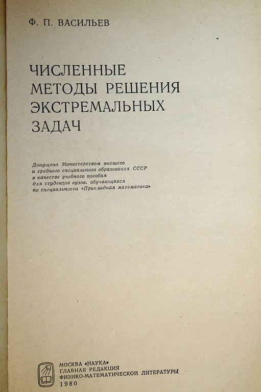 Васильев Ф.П. Численные методы решения экстремальных задач. М.: Наука. 1980г. 518с. Книга написана на основе лекций, которые автор в течение ряда лет читал на факультете вычислительной математики и кибернетики МГУ. В ней изложены наиболее часто используемые на практике методы решения задач минимизации функций и функционалов, а также теоретическое исследование и краткая характеристика вычислительных аспектов этих методов. Учебное пособие рассчитано па студентов университетов и вузов, обучающихся по специальности `прикладная математика`. Книга будет полезна также аспирантам, научным работникам и инженерам. Твердый переплет. Увеличенный формат. Хорошее состояние.