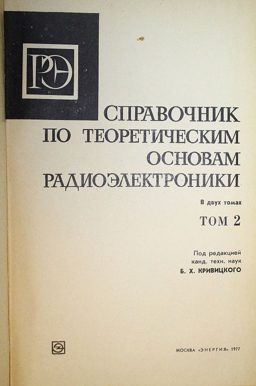 Справочник по теоретическим основам радиоэлектроники. В 2-х томах. Том 2. Под редакцией Б.Х.Кривицкого. М.: Энергия. 1977г. 472с. В справочнике приведены сведения по основам радиоэлектронике. Изложены материалы по теории связи, обнаружению и разрешению сигналов, рассматриваются линейные, нелинейные, параметрические цепи, генераторы гармонических сигналов. Твердый переплет. Энциклопедический формат. Хорошее состояние.