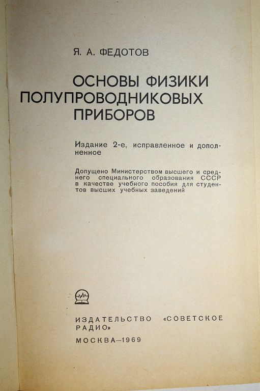 Федотов Я.А. Основы физики полупроводниковых приборов. М.: Советское радио. 1969г. 592с. Основы зонной теории, принципы электропроводности полупроводников, основные соотношения даются в минимальном объеме. Описаны основные типы диодов. Рассматриваются принципы действия, физические параметры и процессы биполярных и униполярных транзисторов в диапазоне низких и высоких частот, тиристоров, лавинных транзисторов, фотодиодов и фототранзисторов, датчиков Холла и др. Кратко излагаются основные сведения о технологии и конструкции полупроводниковых приборов. Значительное место отводится рассмотрению процессов на поверхности, вопросам стабильности и надежности полупроводниковых приборов. Твердый переплет. Обычный формат. Хорошее состояние.