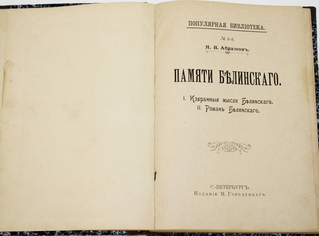Абрамов Я.В. Памяти Белинского. I. Избранные мысли Белинского. II. Роман Белинского. СПб.: Издание Н.Гаврилова и М.Городецкого, 1898. – 77, [3] с., 2 л. ил. Составной владельческий переплет. Обычный формат, 19.5х14 см. Яков Васильевич Абрамов (1858 - 1906) - русский публицист, литературный критик и журналист, исследователь народной жизни; автор рассказов и очерков о судьбах крестьян в пореформенной деревне и жизни обитателей городских окраин. Хорошее состояние.