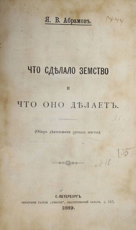 Абрамов Я.В. Что сделало земство и что оно делает. (Обзор деятельности русского земства). СПб.: Тип. газеты `Новости`, 1889. – IV, [2], 288 с. Полукожаный переплет с золотым тиснением на корешке. Увеличенный формат, 23.5х16 см. Яков Васильевич Абрамов (1858 - 1906) — русский публицист, литературный критик и журналист, общественный деятель, исследователь народной жизни; автор рассказов и очерков о судьбах крестьян в пореформенной деревне и жизни обитателей городских окраин. Хорошее состояние. Потертости переплета, передний форзац поновлен, титул и с. 17 `мытые`, дореволюционный штамп.