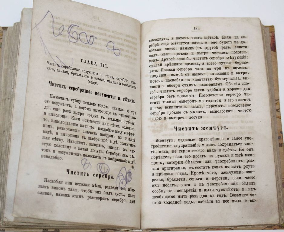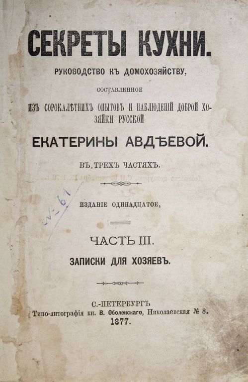 Авдеева Е. Секреты кухни. [в 3 ч.]. Часть III: Записки для хозяев. Руководство к домохозяйству, составленное из сорокалетних опытов и наблюдений доброй хозяйки русской Екатерины Авдеевой. СПб.: Типо-лит. кн. В.Оболенского, 1877. – [2], 238 с. Твердый владельческий переплет. Уменьшенный формат, 17.5х12 см. Редкое издание Екатерины Алексеевны Авдеевой-Полевой (1789-1865) - русской писательницы, автора популярных книг по ведению хозяйства и кулинарии. Удовлетворительное состояние. Реставрация тит. листа, загрязнение отдельных страниц.