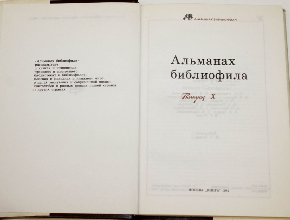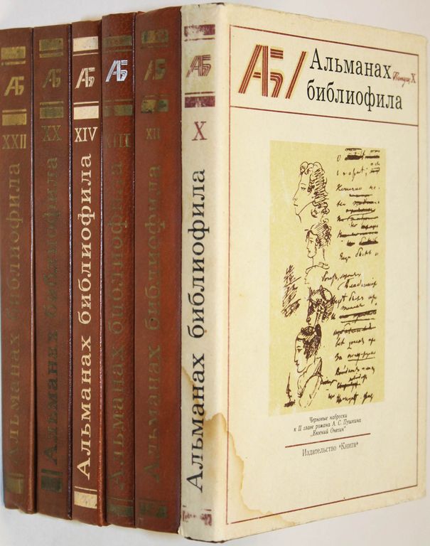 Альманах библиофила. Выпуски 10,12, 13, 14, 20, 22. М.: Книга. 1981- 1987.Альманах библиофила рассказывает о книгах и книжниках прошлого и настоящего, библиотеках и библиофилах, поисках и находках в книжном мире, о делах минувших и современной жизни книголюбов в разных концах нашей страны и других странах. Твердый переплет. Выпуски 6,7,9,и 10 в суперобложках. Обычный формат. Хорошее состояние. Выпуски 13, 20 имеют следы от залития по нижнему полю. Возможна продажа отдельными выпусками по 150 руб.