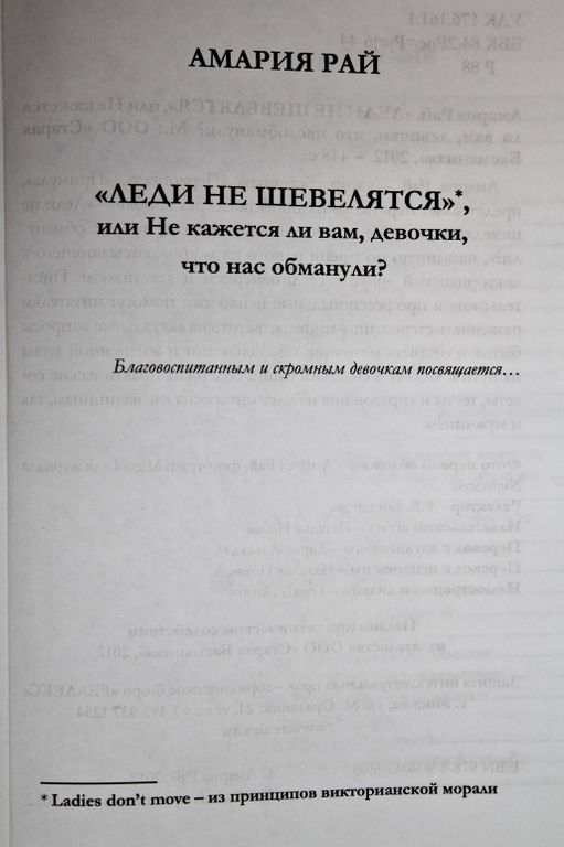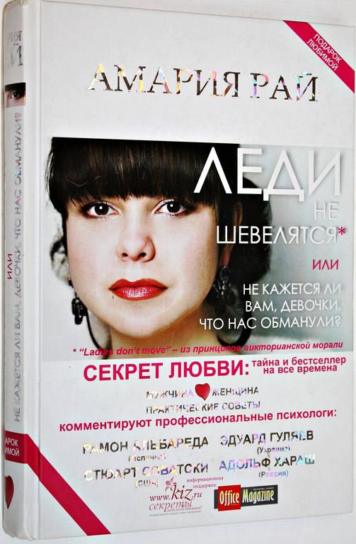Амария Рай. Леди не шевелятся, или не кажется ли вам, девочки, что нас обманули? М.: Старая Басманная. 2012г. 448с. Название книге дал миф, отсылающий читателя к викторианской эпохе с ее лицемерием и аскетизмом, которые и сегодня присутствуют в нашей жизни. Писательница и профессиональные психологи помогут читателям избавиться от навязчивых стереотипов-мифов, ответить на актуальные вопросы бытия и открыть источник сексуальности и жизненной силы на пути к любви и счастью. Книга содержит практические советы, тесты и упражнения и будет интересна как женщинам, так и мужчинам.Эксперты, комментировавшие мифы о мужчинах, о женщинах, о сексе и о взаимоотношениях: психолог-практик Адольф Хараш (Россия), биоэнерготерапевт Эдуард Гуляев (Украина), сексолог Рамон Альбареда (Испания) и семейный терапевт Стюарт Соватски (США).Своими мнениями о том, как достичь любви и гармонии, на страницах книги поделились известные россияне: оперная прима Любовь Казарновская и Роберт Росцик, телеведущая Тутта Ларсен и Валерий Колосков, актриса Любовь Толкалина, режиссер, писатель Александр Стефанович, поэт Александр Шаганов. Твердый переплет. Увеличенный формат. Отличное состояние.