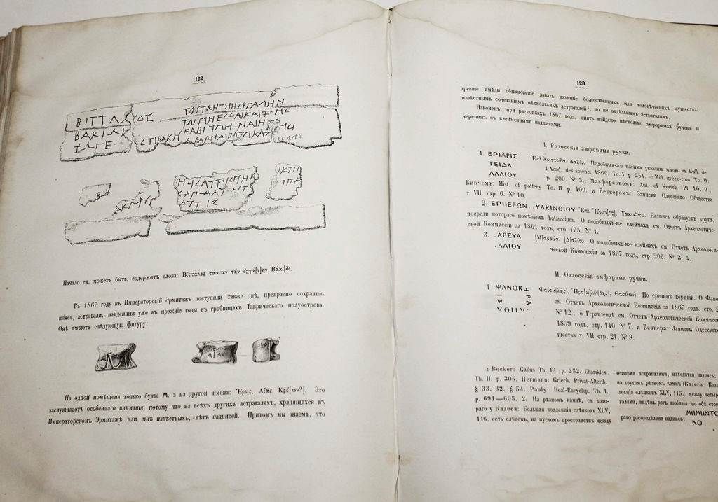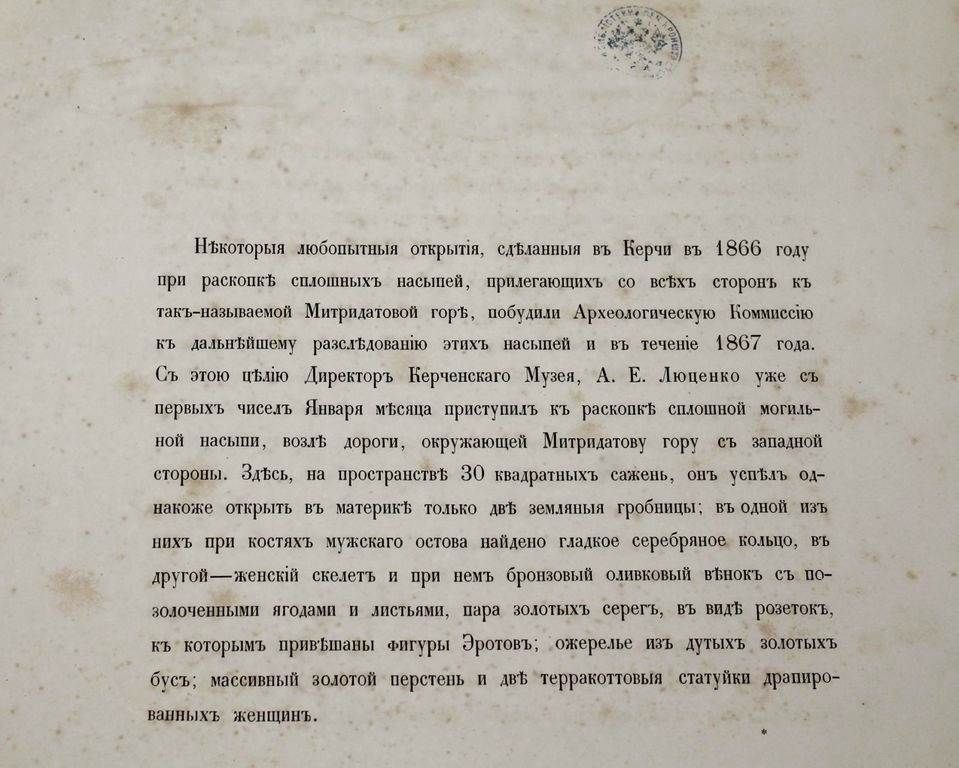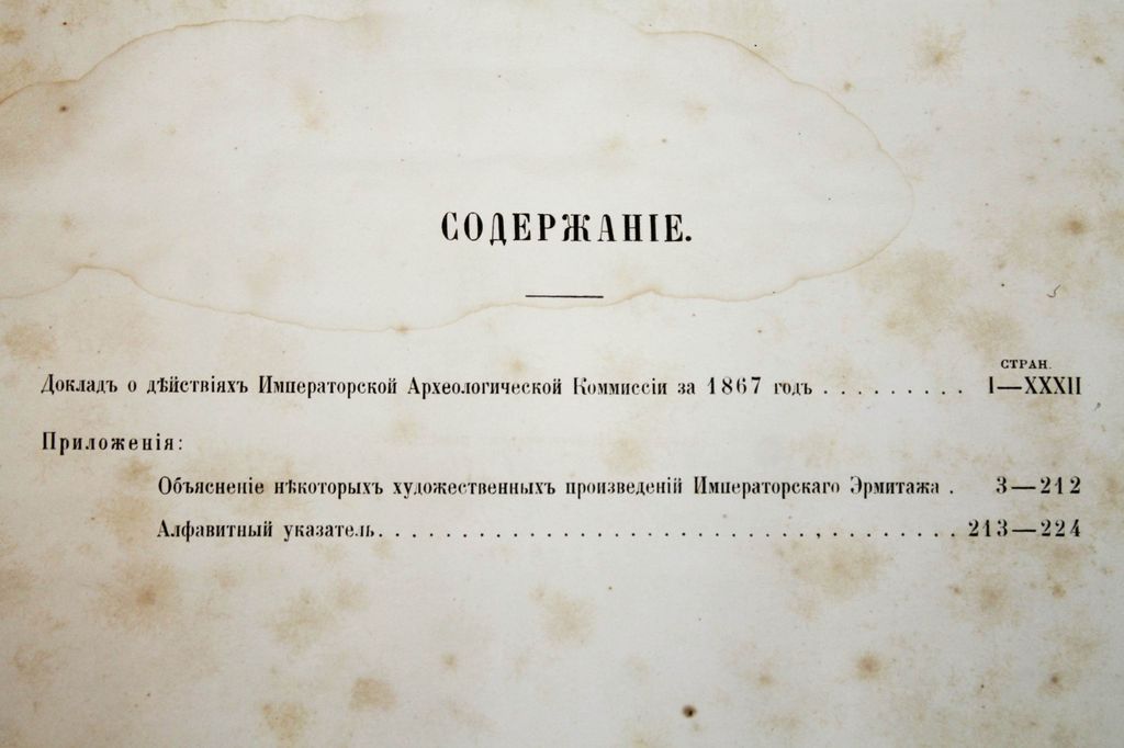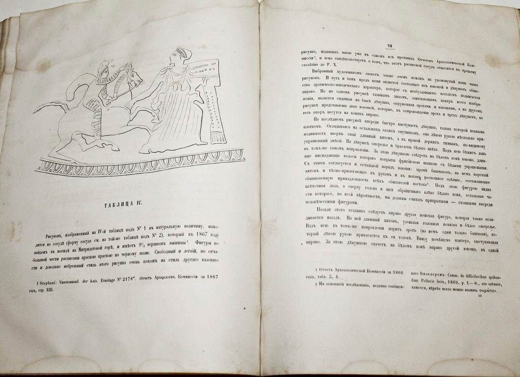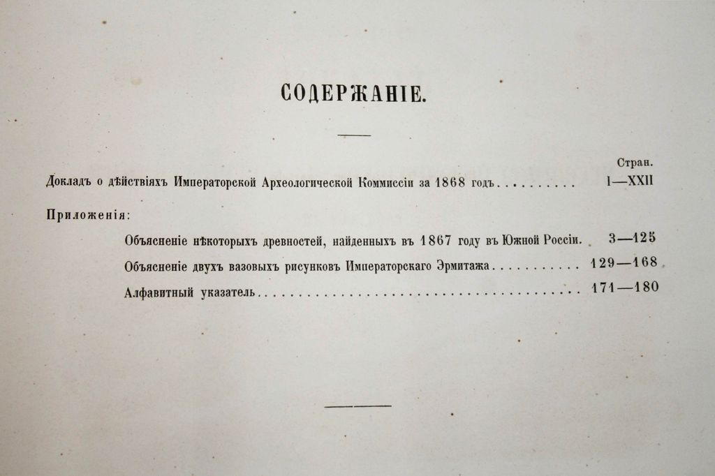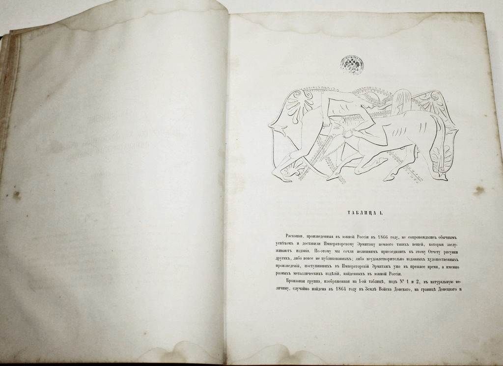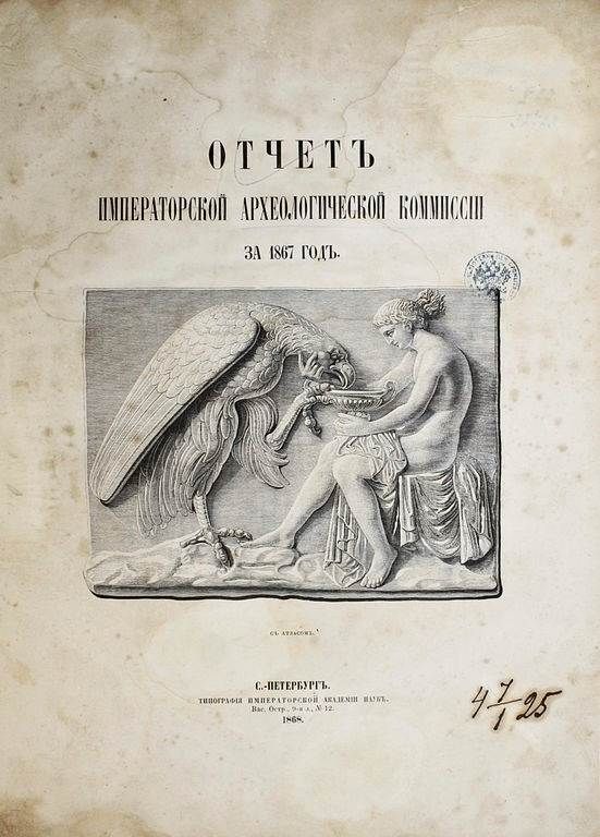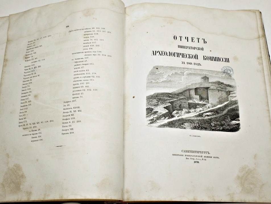 Отчет Императорской археологической комиссии за 1867 и 1868 годы. СПб.: Типография Императорской академии наук, 1868-1870. – [4], XXXII, 224 с., ил.; [4], XXII, 180 с., ил. Два годовых выпуска в одном полукожаном переплет. Очень большой формат, 35х26 см. К началу 1850-х гг. в России уже широко была развита археология, однако координация в этой области отсутствовала, что приводило к столкновениям различных центральных и местных ведомств. В 1856 г. был издан указ о передаче всех археологических раскопок, проводимых в ведомстве Министерства Императорского Двора, в ведение графа Сергея Григорьевича Строганова. По его представлению 15 февраля 1859 года была учреждена Александром II Императорская археологическая комиссия, которая стала первым в Российской империи государственным археологическим учреждением. Печатным органом комиссии служили ее "Отчеты". Хорошее состояние. Небольшая потертость переплета, дефект верхней крышки, форзацы поновлены, разводы по верхнему полю книжного блока, следы инвентарных отметок, дореволюционные штампы, `лисьи` пятна.
