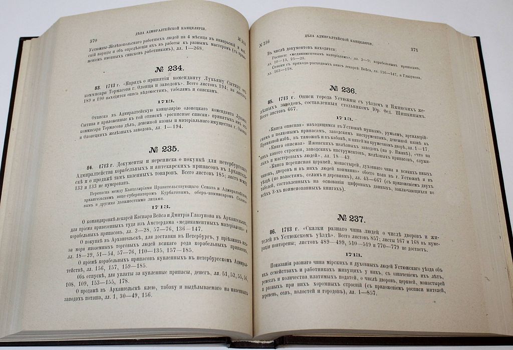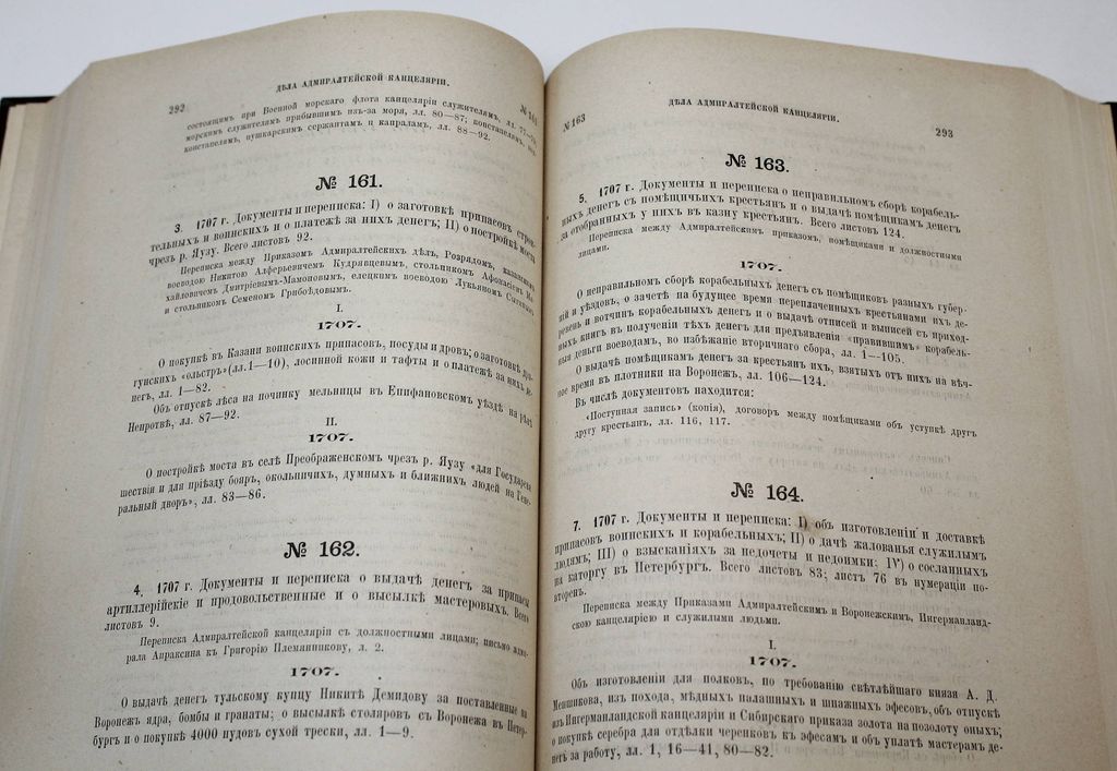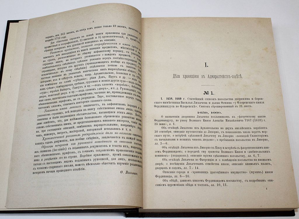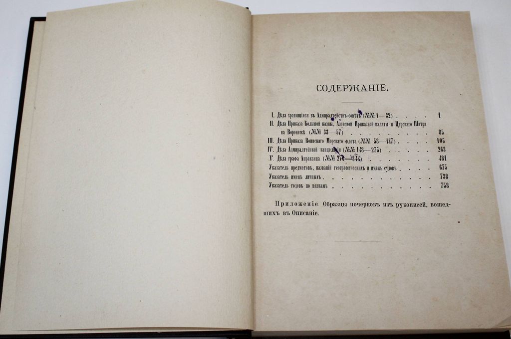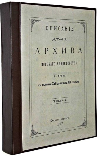 Описание дел Архива Морского министерства за время с половины XVII до начала XIX столетия. [в 10 т.]. Том I. СПб.: Тип. Морского министерства, 1877. – [2], Х, 759, [5] с., 8 л. факс. Твердый владельческий переплет. Энциклопедический формат, 28х21.5 см. Во второй половине XIX - нач. XX вв. отечественная историография достигла впечатляющих результатов в деле введения в научный оборот документальных материалов по российской военно-морской истории. `Описание дел архива Морского министерства за время с половины XVII до начала XIX столетия` редкое издание, публиковавшееся в Санкт-Петербурге с 1877 по 1906 год. С о д е р ж а н и е: Дела хранящиеся в Адмиралтействе-совете; Дела Приказа Большой казны, Азовской Приказной палаты и Царского Шатра в Воронеже; Дела Приказа Военного Морского флота; Дела Адмиралтейской канцелярии; Дела графа Апраксина. Хорошее состояние. Утрата авантитула, тит. листа и 1 л. факс. `Мытый` экземпляр.
