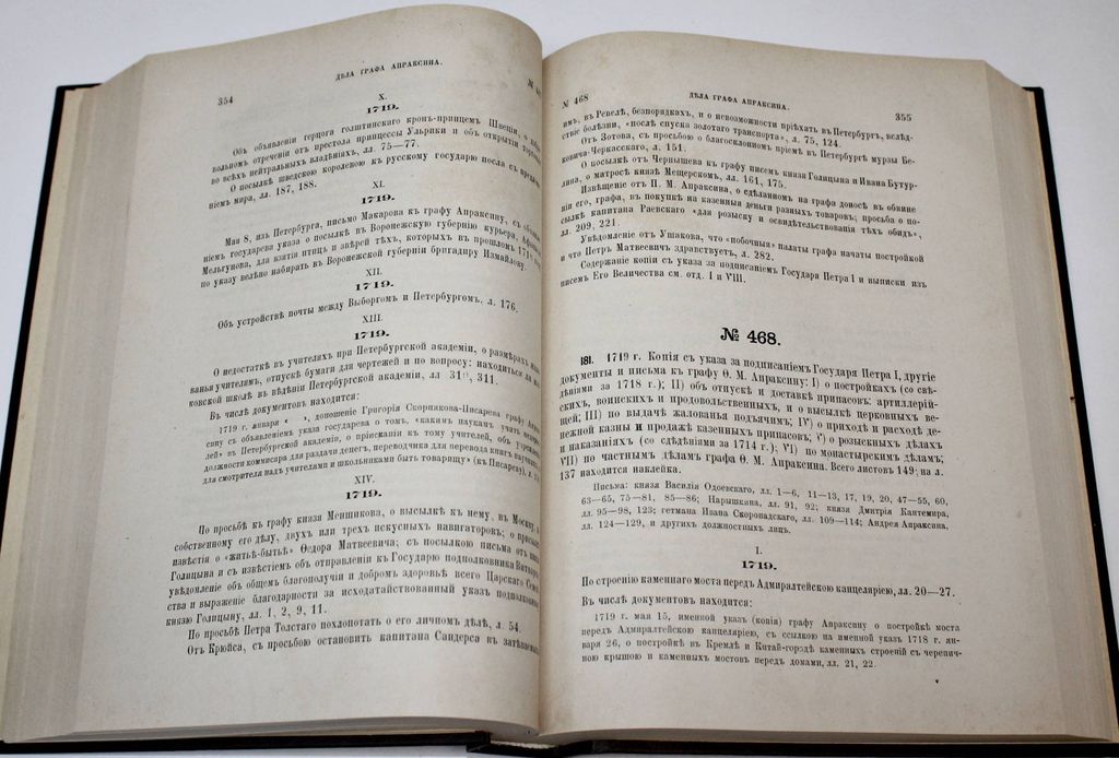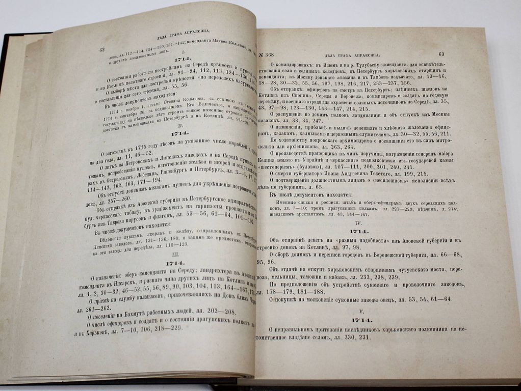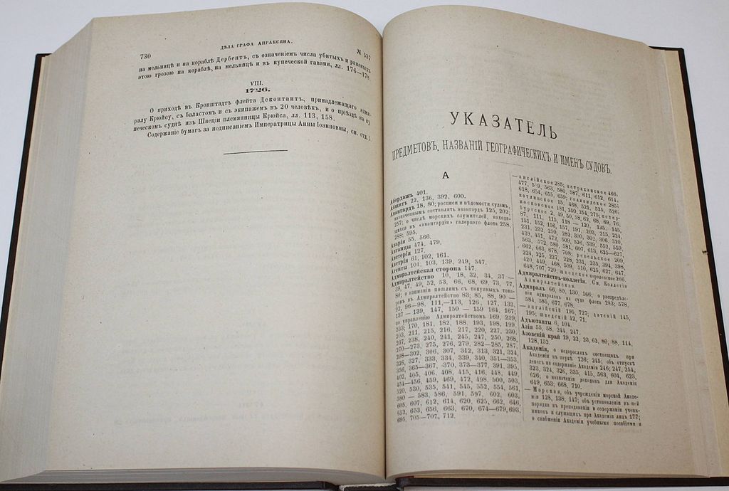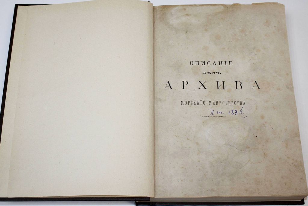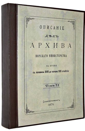 Описание дел Архива Морского министерства за время с половины XVII до начала XIX столетия. [в 10 т.]. Том II. СПб.: Тип. Морского министерства, 1879. – [2], 842, [4] с. Твердый владельческий переплет. Энциклопедический формат, 28х21.5 см. Во второй половине XIX - нач. XX вв. отечественная историография достигла впечатляющих результатов в деле введения в научный оборот документальных материалов по российской военно-морской истории. `Описание дел архива Морского министерства за время с половины XVII до начала XIX столетия` редкое издание, публиковавшееся в Санкт-Петербурге с 1877 по 1906 год. С о д е р ж а н и е: Дела графа Апраксина; Указатель предметов, названий географических и имен судов; Указатель имен личных; Указатель годов по вязкам. Хорошее состояние. Утрата титула, листа оглавления и последнего листа указателя. `Мытый` экземпляр.