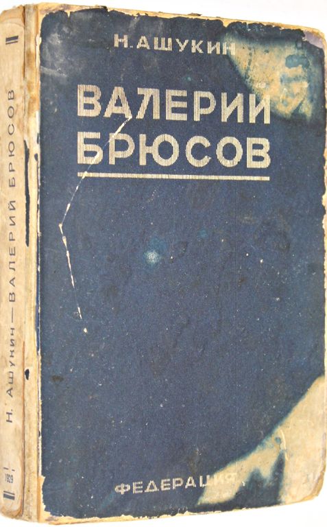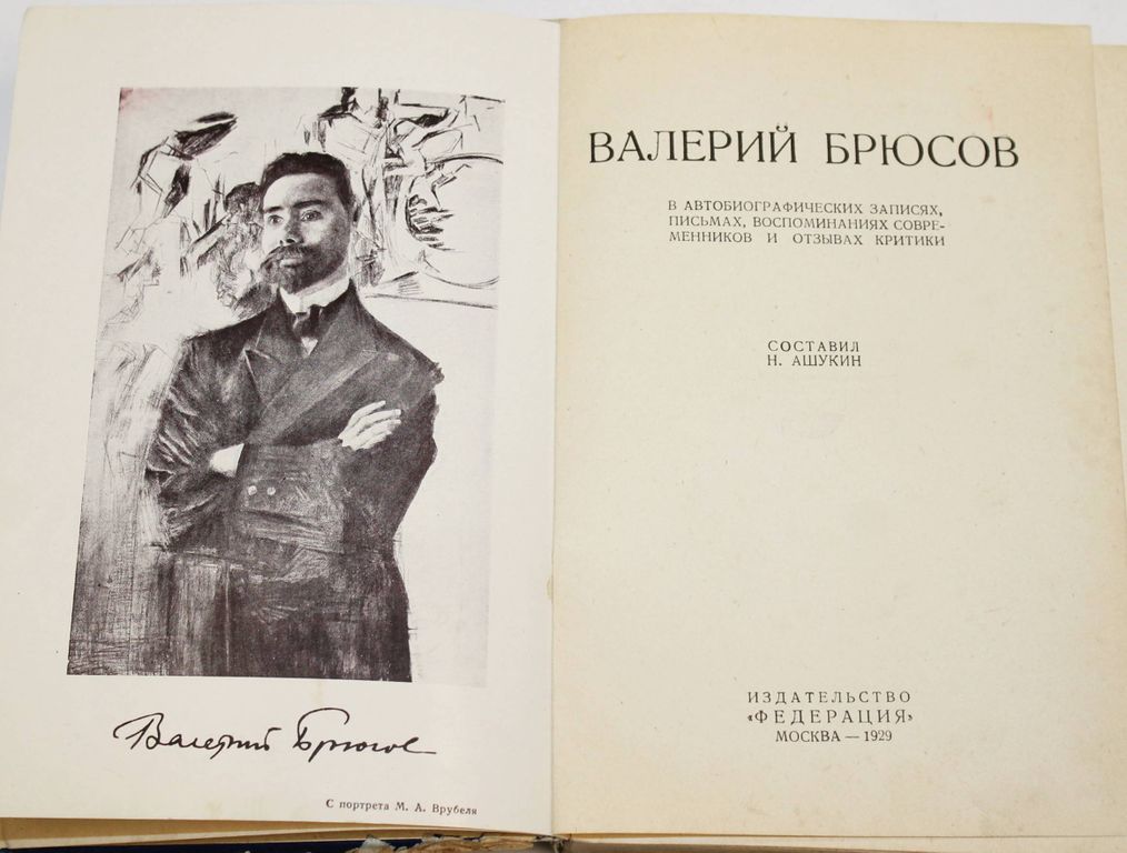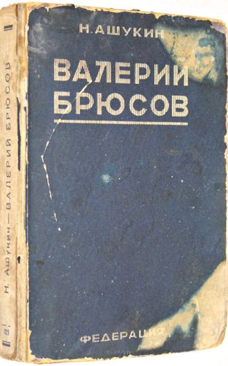 Ашукин Н. Валерий Брюсов. В автобиографических записках, письмах, воспоминаниях современников и отзывах критики. М.: `Федерация`, 1929. – 400, [4] с., 1 л. портр. Твердый издательский переплет. Обычный формат, 20х13.5 см. Книга представляет собой летопись жизни поэта, мозаически составленную из его автобиографических записей, воспоминаний современников и отзывов современной ему критики. На фронтисписе портрет Брюсова работы Врубеля. Тираж 3000 экз. Хорошее состояние. Потертости переплета.