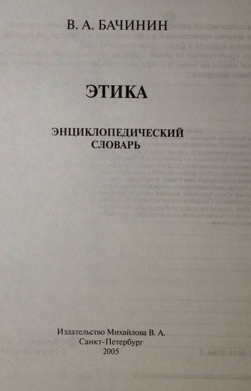 Бачинин В.А. Этика. Энциклопедический словарь. СПб.: Издательство Михайлова В.А. 2005г. 288 с. Энциклопедический словарь по этике содержит информативные статьи о различных сторонах духовно-нравственной жизни личности и общества, об истории религиозно-нравственных исканий и философско-этических идей. Словарь ориентирован на самый широкий круг читателей, стремящихся приобрести начальные знания по этике, и в первую очередь на старшеклассников и студентов высших учебных заведений. Твердый переплет. Увеличенный формат. Хорошее состояние.