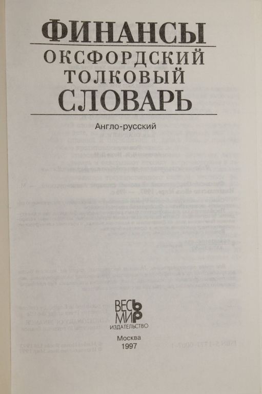 Батлер Б., Джонсон Б., Сидуэлл Г. Финансы. Оксфордский толковый словарь. Англо-русский. М.: Весь мир. 1997г. 496 с. Словарь является дополнением к ранее изданному и завоевавшему заслуженную популярность словарю `Бизнес. Оксфордский толковый словарь`. Предназначен как для профессиональных работников сферы финансов, так и для студентов, ее изучающих. Статьи словаря охватывают терминологию, используемую в современном банковском деле, на финансовых и валютных рынках, в практике коммерческого кредитования и взыскания долгов, в страховом бизнесе. Издание снабжено указателем русских терминов. Твердый переплет. Обычный формат. Хорошее состояние.