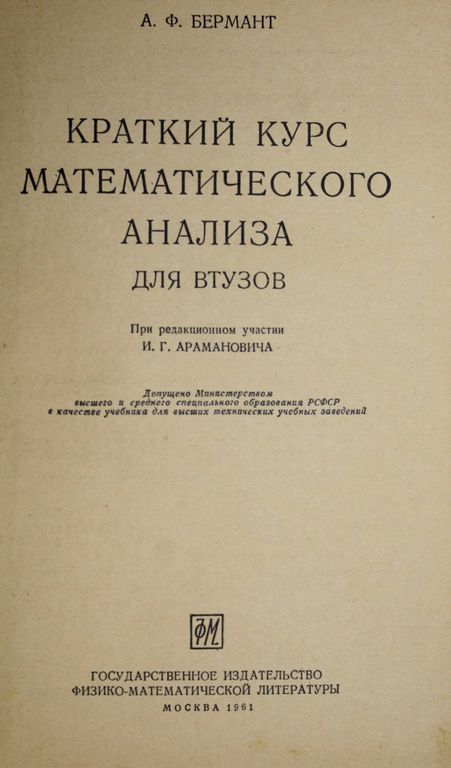Бермант А.Ф. Краткий курс математического анализа. М.: Физматгиз. 1961г. 300 руб. В корзину Описание Описание Бермант А.Ф. Краткий курс математического анализа. М.: Физматгиз. 1961г. 664 с. Твердый переплет. Увеличенный формат. Хорошее состояние. Вас также может заинтересоватьВ корзинуХида Т. Броуновское движение. М.: Наука. 1987г.380 ₽ В корзину