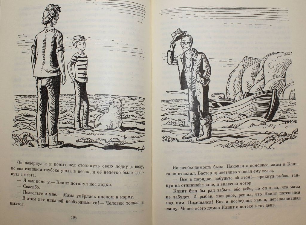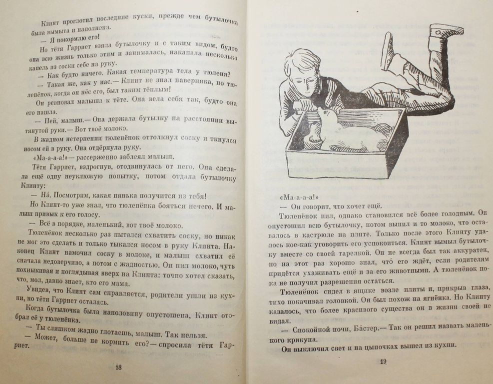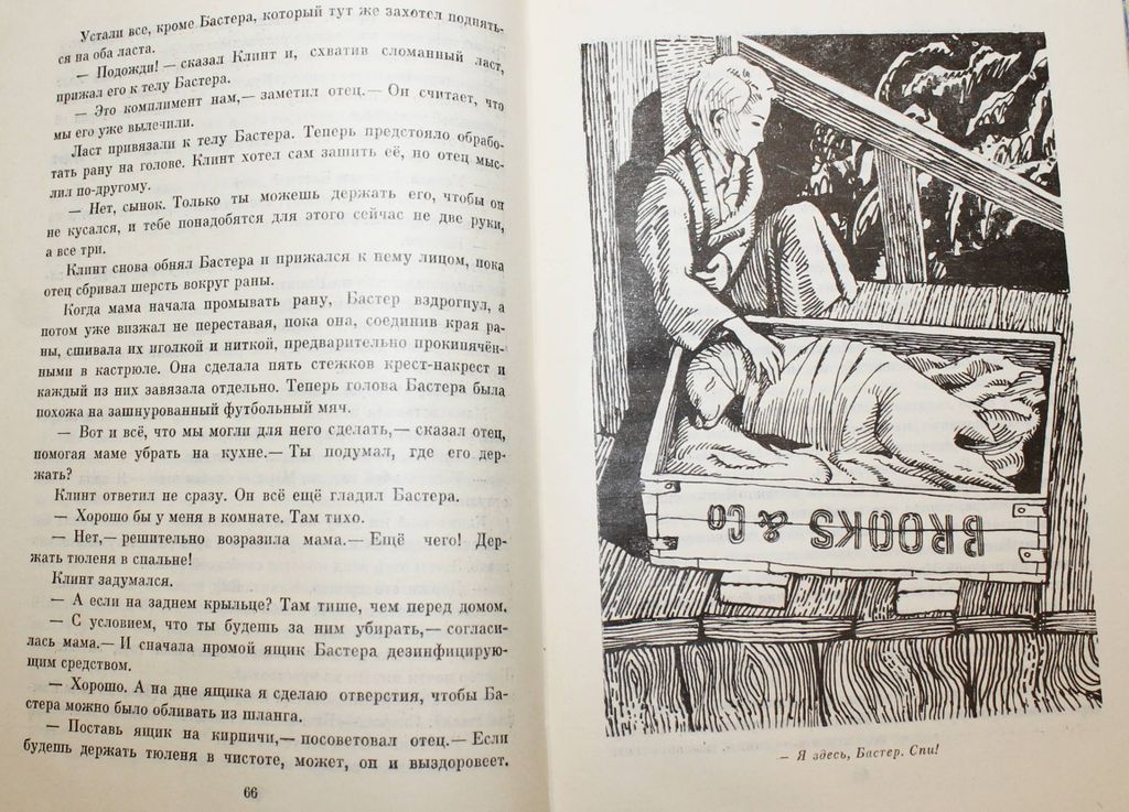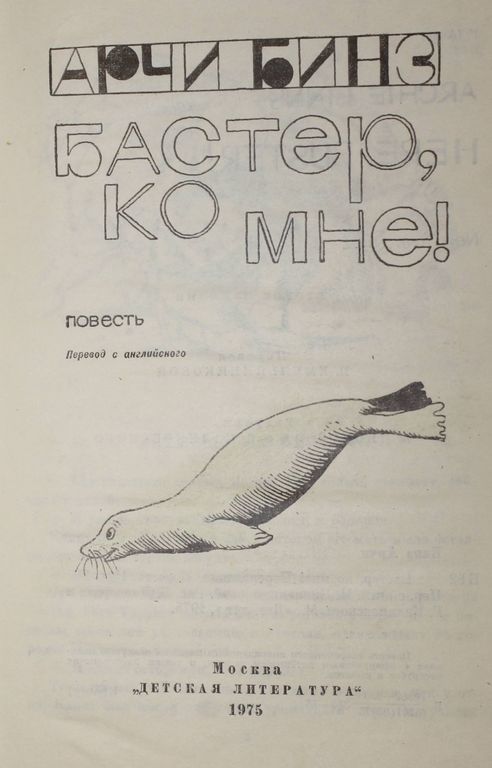 Бинз А. Бастер, ко мне! Рис. Б.Диодорова и Г.Калиновского. М.: Детская литература. 1975г. 144 с., ил. Клинт живет с мамой и папой в поселке на берегу Атлантики. Хоть он еще мал, но уже отлично управляется с непростым домашним хозяйством. Он может самостоятельно подоить корову, наловить рыбы и даже один выходит в море на небольшом ялике. И вот однажды он случайно находит осиротевшего новорожденного тюлененка. Малыш был обречен на верную гибель, если бы Клинт не проявил столько усердия, терпения и любви в воспитании столь необычного домашнего питомца, доставлявшего окружающим немало хлопот. Но настоящая доброта побеждает все неприятности, и из веселого проказника Бастера — так мальчик назвал своего питомца — вырос замечательный ,верный друг, который ни за что не хотел расставаться со своим спасителем...Твердый переплет. Обычный формат. Хорошее состояние, загрязн.