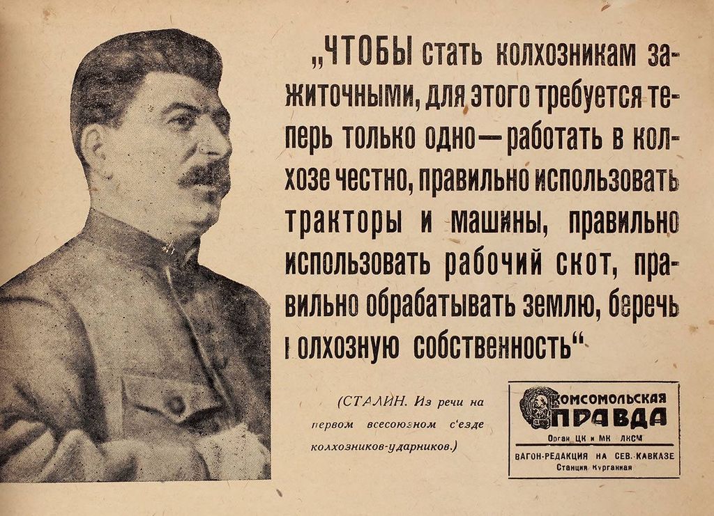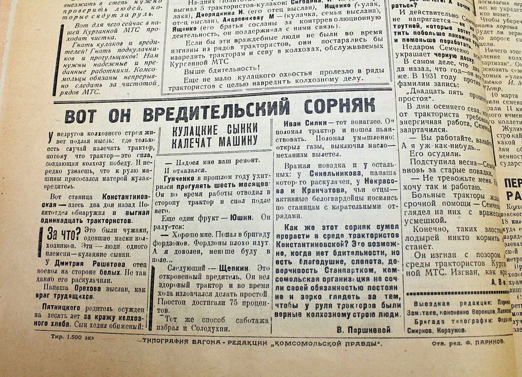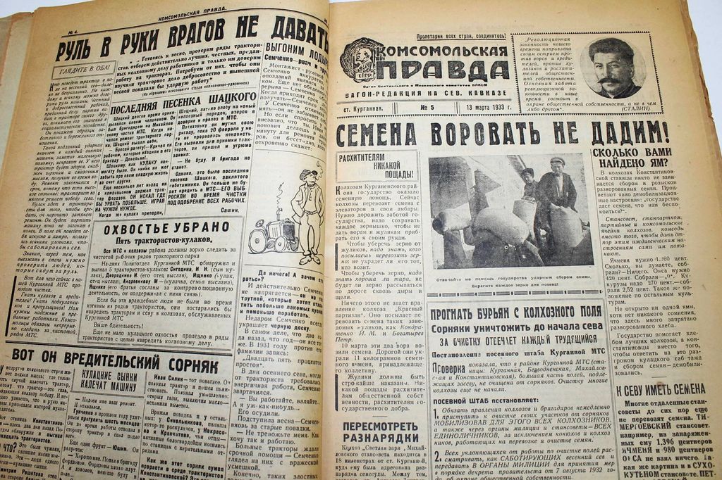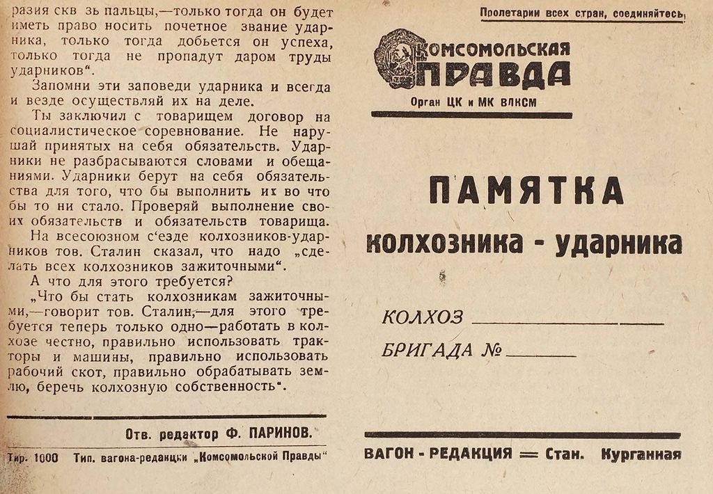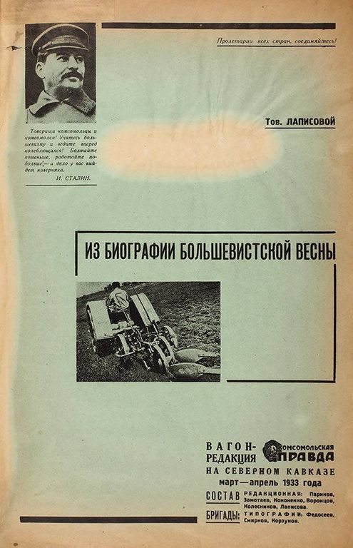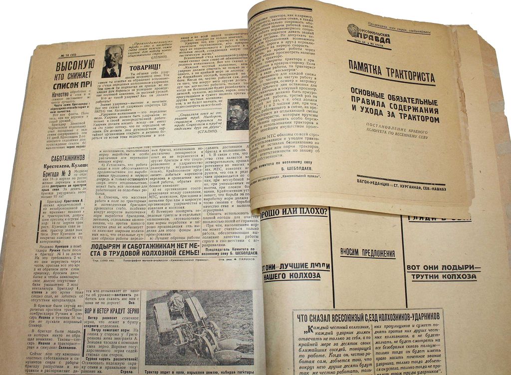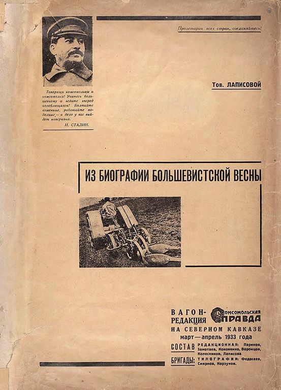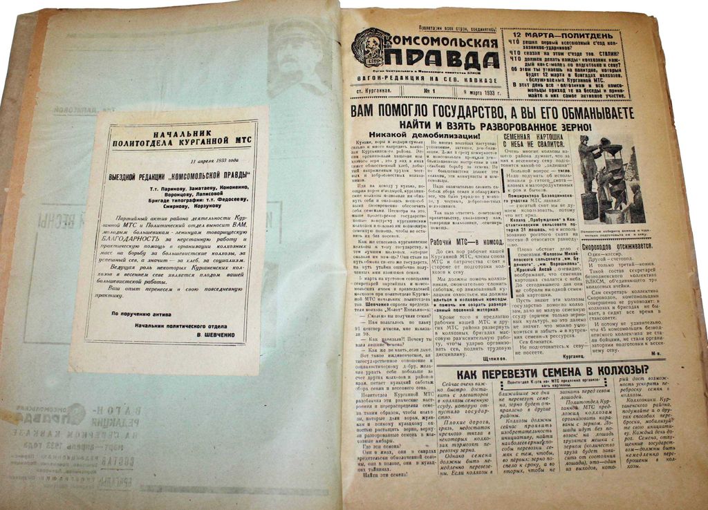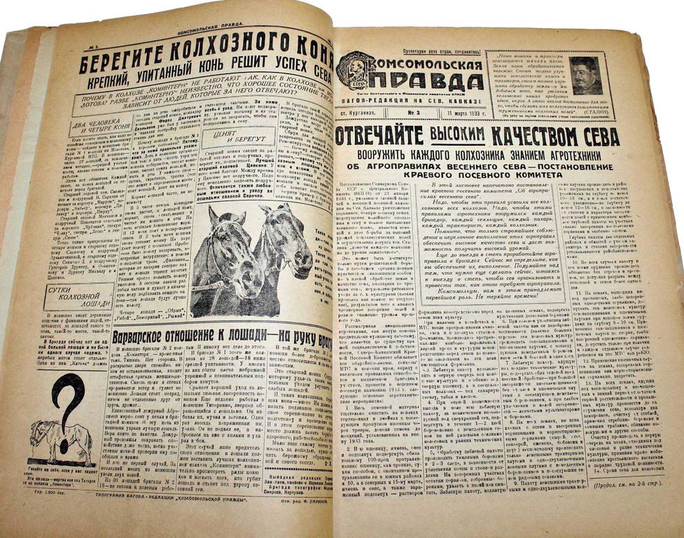 Из биографии большевистской весны. [Издательская подшивка специальных номеров газеты `Комсомольская правда`, выпущенных выездной редакцией]. № 1-46 + 1 внеочередной вып. + 9 листовок. Ст. Курганная; Ст. Морозовская: Вагон-редакция `Комсомольской правды` на Северном Кавказе, 1933. [Каждый номер: 2 с., ил.]. Номера разного формата: 40 х 29 см; 34 х 26,5 см; 27,5 х 20 см. Выездная редакция `Комсомольской правды` (вагон-редакция) помещалась в железнодорожном вагоне; там же находилась и передвижная типография. В вошедших в подшивку номерах газеты освещалась коллективизация и посевная на территориях юга России, заселенных казаками: в Ростовской области и в Краснодарском крае. № 1-35 были выпущены в станице Курганная (сейчас гор. Курганск Краснодарского края); № 36-46 и внеочередной были выпущены в станице Морозовская (сейчас гор. Морозовск Ростовской области). Газета выпускалась с 9 марта по 25 апреля 1933 года тиражом 1500 экземпляров, внеочередной номер от 16 апреля имел тираж 1000 экз.; листовки были отпечатаны в количестве от 300 до 1000 экземпляров. Вся бригада Вагона-редакции состояла из 8 человек: ответственный редактор Ф. Паринов; сотрудники - Замотаев, Кононенко, Воронцов, Лаписова; рабочие типографии - Федоссев, Смирнов, Корзунов. Такие подшивки были созданы только для членов выездной редакции `Комсомольской правды`, редакции в Москве и для руководства. Настоящий экземпляр принадлежал сотруднику выездной редакции Лаписовой. Большая редкость! Возможно, что это единственный сохранившийся экземпляр подшивки. Хорошее состояние. На обороте второй обложки наклеена благодарственная грамота от нач. политотдела Курганной МТС В. Шевченко.