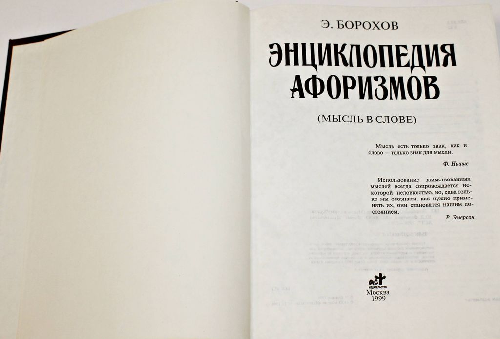 Борохов Э. Энциклопедия афоризмов: Мысль в слове. М.: АСТ. 1999г. 350 руб. В корзину Описание Описание Борохов Э. Энциклопедия афоризмов: Мысль в слове. М.: АСТ. 1999г. 720с. Твердый переплет. Энциклопедический формат. Хорошее состояние.