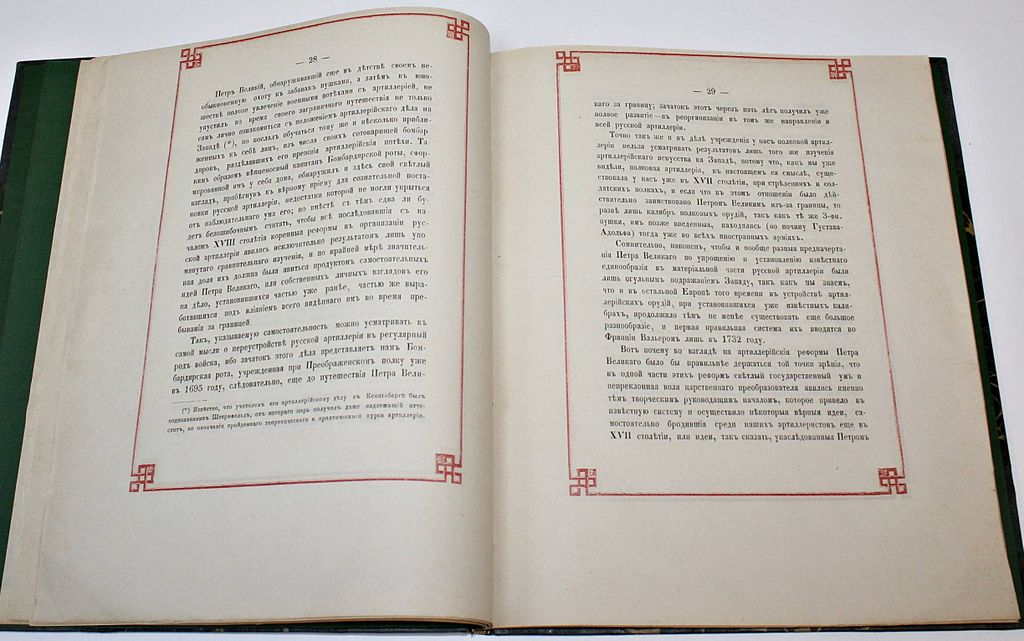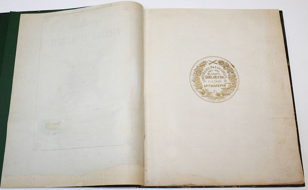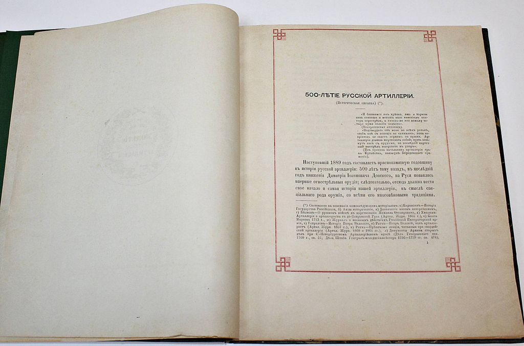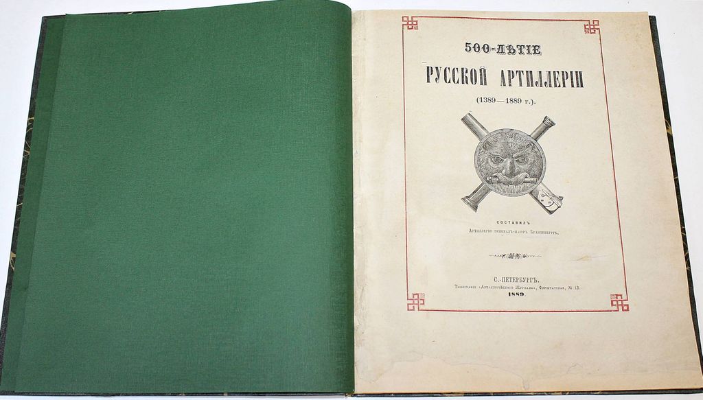 Бранденбург Н. 500-летие русской артиллерии (1389 – 1889 г.). Юбилейное издание: Обзор развития русской артиллерии. СПб.: Тип. `Артиллерийского журнала`, 1889. – [4], 118 с. В современном полукожаном переплете. Энциклопедический формат, 28.5х24 см. Николай Ефимович Бранденбург (1839 - 1903) - русский археолог и военный историк, музейный работник, генерал-лейтенант артиллерии // Исторический очерк становления артиллерийского дела в России, со времен Дмитрия Донского до организации осадных парков, которых в России три: два силой в 400 и Кавказский в 230 орудий. Хорошее состояние. Книжный блок подрезан под переплет, реставрация тит. листа, `мытые` штампы.