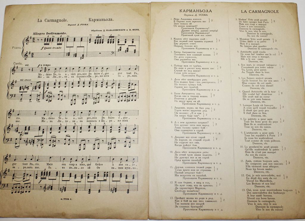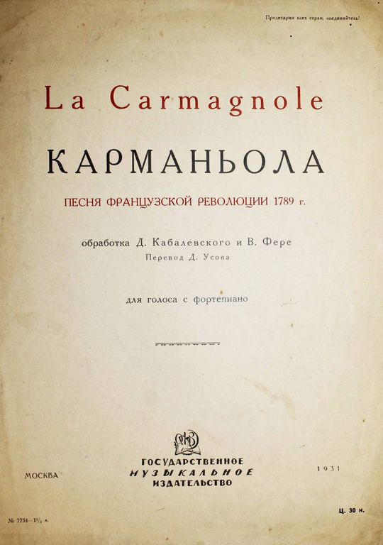 La Carmagnole. Карманьола. Песня французской революции 1789 г. Обработка Д.Кабалевского и В.Фере. Перев. Д.Усова. Для голоса и фортепиано. М.: Музгиз, 1931. – 6 с., нот. Мягкая обложка. Очень большой формат, 32х22.5 см. Карманьола - анонимная, но очень популярная песня времен Великой французской революции, сочинённая в 1792 г. Название, вероятно, происходит от имени итальянского города Карманьола, где большую часть населения составляла рабочая беднота. Текст на французском и русском языках Тираж 3000 экз. Хорошее состояние.