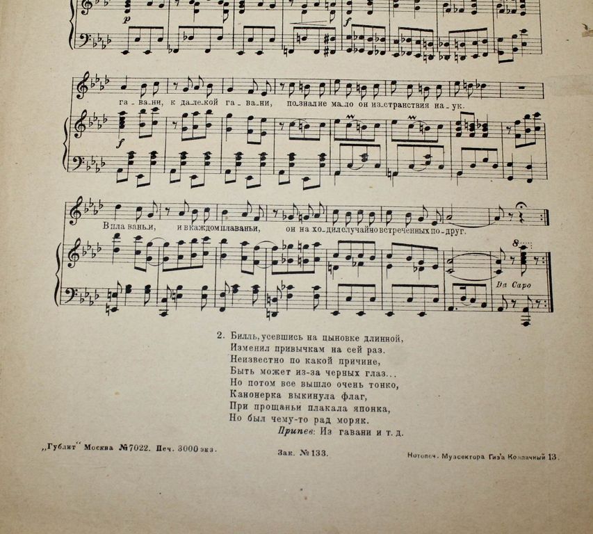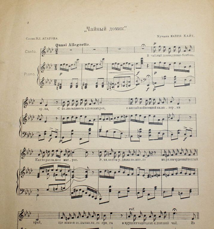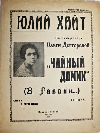 Хайт Ю. `Чайный домик` (В Гавани…). Песенка. Слова В.Агатова. Из репертуара Ольги Дегтеревой. М.: Изд. автора, 1924. – 4 с., нот. Очень большой формат, 35.5х25.5 см. Песня `Чайный домик` была написана в 1922 году российскими евреями - автор стихов Вэлвл Гуревич (псевд. Владимир Агатов), а музыку написал Юлий Хайт. Первоначальный вариант создан ими на сюжет оперы Джакомо Пуччини `Мадам Баттерфляй`, в русской версии - `Чио-Чио-сан`. Действие происходит в Нагасаки в конце XIX века. В.Агатов также известен как автор двух советских шлягеров - `Тёмная ночь` и `Шаланды`. Композитор Юлий Хайт автор популярной песни `Всё выше`, ставшей в 1933 году официальным маршем сталинских ВВС. Тираж 3000 экз. Хорошее состояние. Отметки магазина.