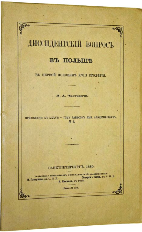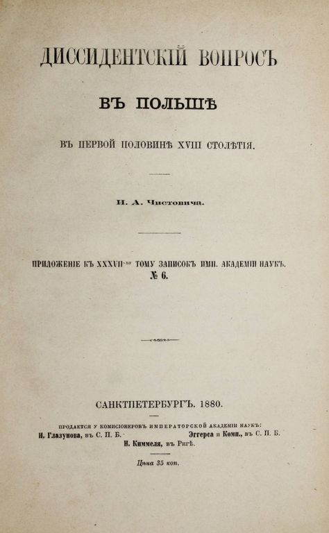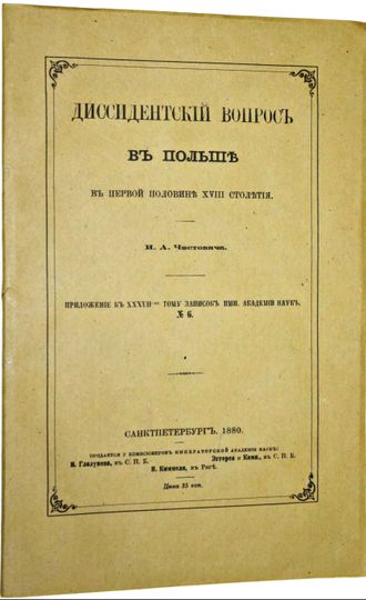 Чистович И.А. Диссидентский вопрос в Польше в первой половине XVIII столетия. Приложение к XXXVII -му тому записок Императорской Академии наук. №6. СПб.: Тип. Имп. Аккад. наук, 1880. – 82 с. Мягкая обложка. Увеличенный формат, 24х15.5 см. Илларион Алексеевич Чистович (1828 - 1893) - русский писатель, церковный историк, доктор богословия. Тайный советник. С о д е р ж а н и е: Борьба поляков против Андрусовского договора о `Вечном мире`, заключенного с Москвой в 1686 году. Очень хорошее состояние. Обложка восстановлена с оригинала.
