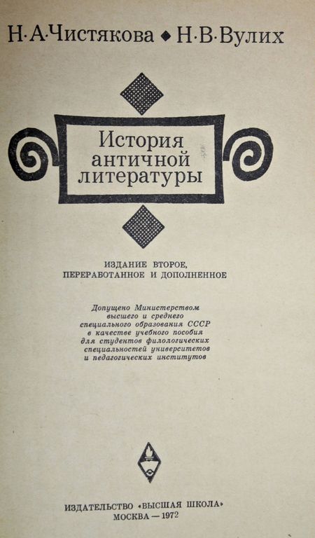 Чистякова Н. А., Вулих Н. В. История античной литературы. Учебное пособие. Изд. 2-е, перер. и доп. М.: Высшая школа. 1972г. 456 с. Содержание: Греческая литература; Архаическая греческая литература; Аттический период греческой литературы; Эллинистическая литература; Греческая литература периода римского владычества; Римская литература; Римская литература эпохи республики; Римская литература эпохи империи. Твердый переплет. Увеличенный формат. Хорошее состояние.