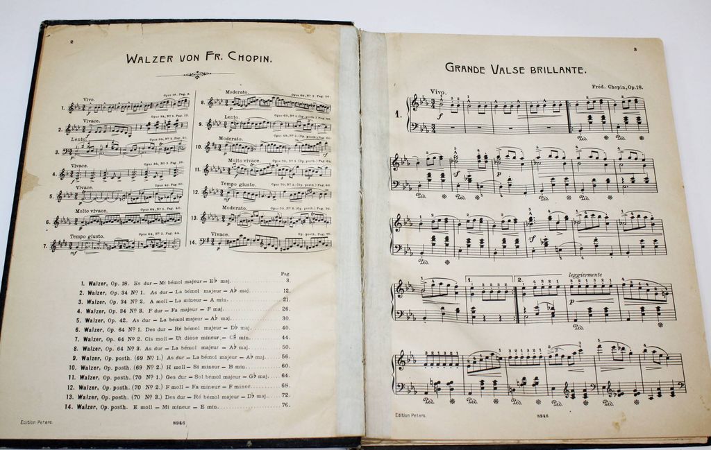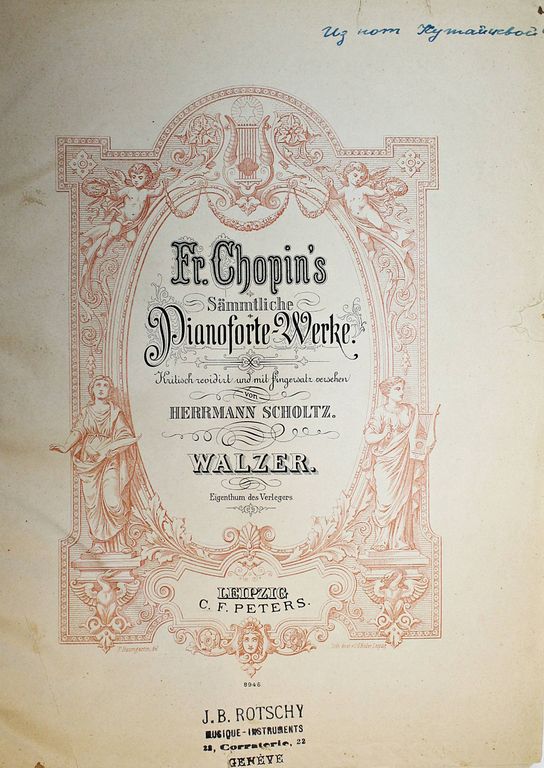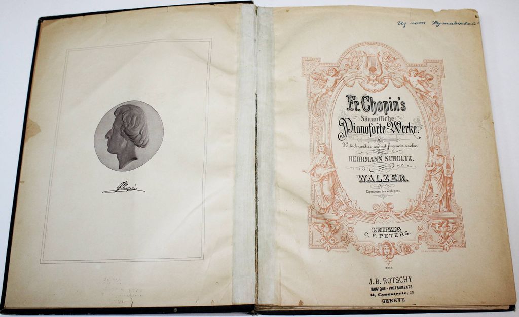 Chopin Fr. Sammtliche Pianoforte – Werke. Walzer. Leipzig: C.F.Peters, 190?. – 78, 104 с., нот., 1 л. портр. Твердый владельческий переплет. Энциклопедический формат, 30.5х24 см. Фредерик Шопен - автор многочисленных произведений для фортепиано. Крупнейший представитель польского музыкального искусства. По-новому истолковал многие жанры: возродил на романтической основе прелюдию, создал фортепианную балладу, опоэтизировал и драматизировал танцы - мазурку, полонез, вальс; превратил скерцо в самостоятельное произведение. Обогатил гармонию и фортепианную фактуру; сочетал классичность формы с мелодическим богатством и фантазией. Удовлетворительное состояние. Реставрация отдельных листов.