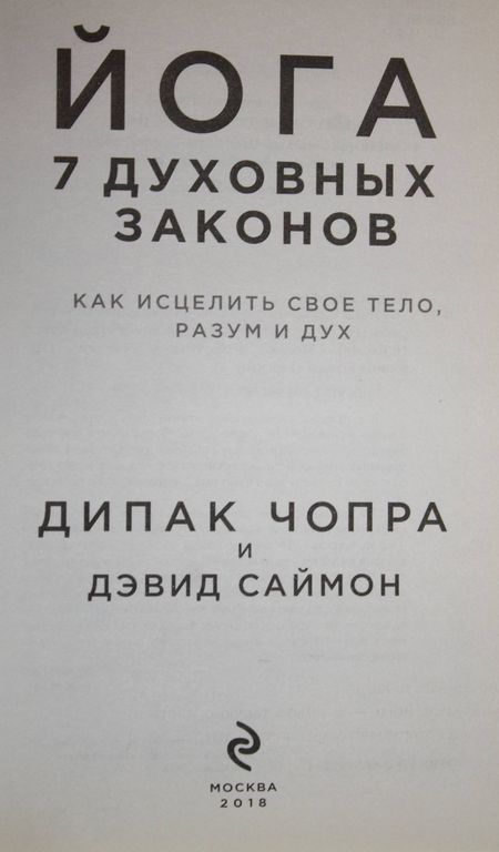 Чопра Д. Йога 7 духовных законов. Как исцелить свое тело, разум и дух. М.: Эксмо. 2018г. 224с.,ил. В этой книге известный индийский врач и писатель Дипак Чопра и Дэвид Саймон, его единомышленник и врач-невропатолог, рассказывают о духовных законах йоги. Здесь вы найдете дыхательные упражнения, мантры, медитации, правильную последовательность поз, которые полностью преобразят вашу жизнь. Мягкий переплет. Обычный формат. Очень хорошее состояние.