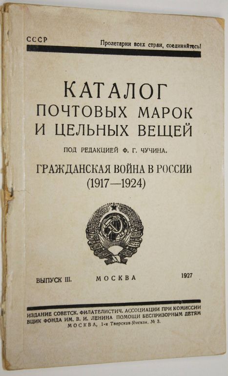 Каталог почтовых марок и цельных вещей. Гражданская война в России (1917 – 1924). Выпуск III. Под ред. Ф.Г.Чучина. М.: Издание уполномоченного по филателии и бонам комиссии ВЦИК Фонда им. В.И.Ленина помощи беспризорным детям, 1927. – 132 с., ил. Мягкая обложка. Уменьшенный формат, 17.5х11.5 см. Федор Григорьевич Чучин (1883 - 1942) - участник революционного движения, партийный и советский деятель, инициатор и один из первых организаторов советской филателии. Филателистические каталоги Ф.Г. Чучина - уникальные по своей ценности описательные каталоги русских и советских почтовых марок за все время их существования. При составлении каталогов были использованы официальные документы, архивные материалы и вся известная специальная филателистическая литература. Каталог иллюстрирован репродукциями марок, сделанными по вновь изготовленным клише. Помимо прочего, в каталоге обозначена ценность каждой марки. Хорошее состояние. Незначительные надрывы корешка.