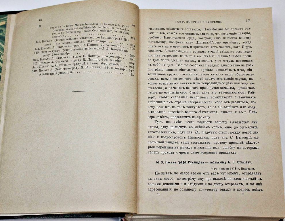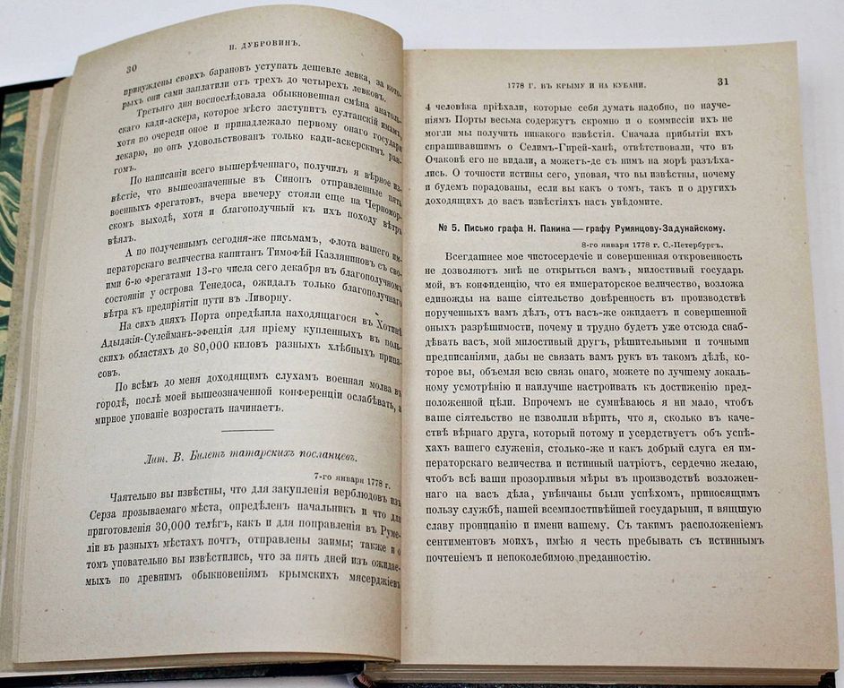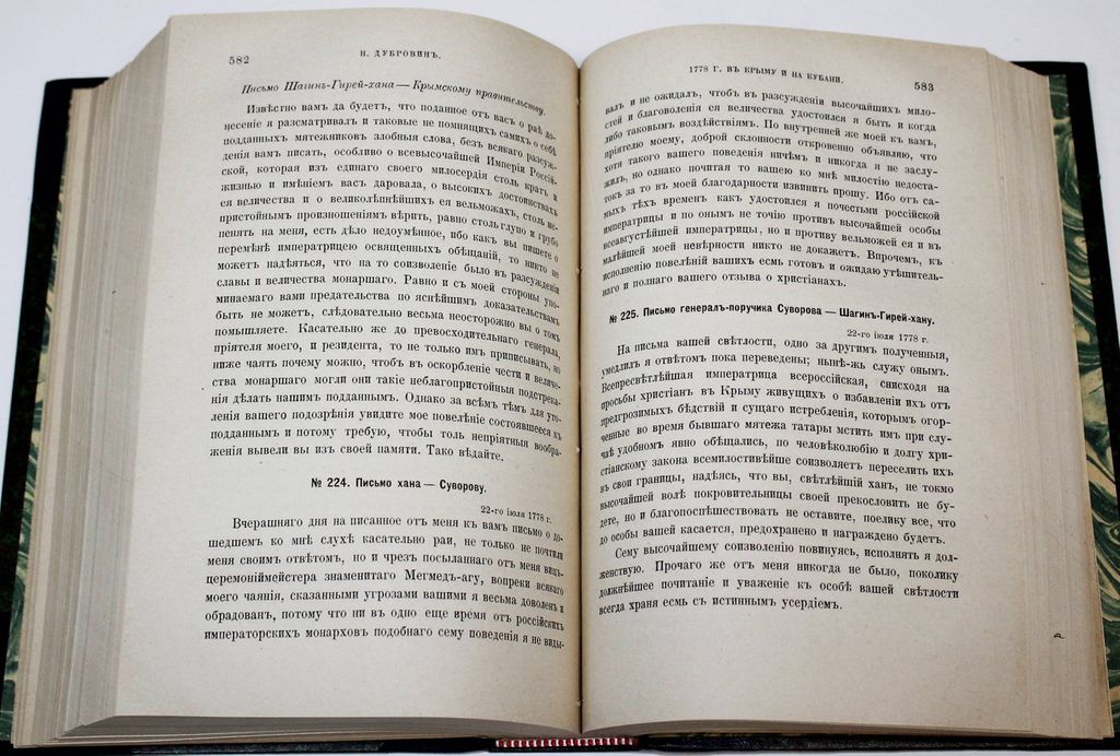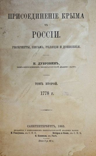 Дубровин Н. Присоединение Крыма к России. Рескрипты, письма, реляции и донесения. [в 4 т.]. Том 2: 1778 г. СПб.: Тип. Имп. Акад. наук, 1885. – [4], XX, 17 - 923 с. В современном полукожаном переплете. Увеличенный формат, 23х16 см. Фундаментальный труд русского историка Николая Фёдоровича Дубровина (1837–1904) представляет собой сборник документов, связанных с событиями, приведшими к присоединению Крыма к России. Дубровин рассматривает деятельность российских дипломатов и военачальников, освещает положение крымско-татарского общества, внутренние конфликты и борьбу за власть, а также роль Османской империи и европейских держав в судьбе Крымского ханства. Особое внимание уделено Русско-турецкой войне 1768–1774 гг., Кючук-Кайнарджийскому миру и процессу постепенного вхождения Крыма в состав России. Многие документы в этом сборнике были изданы впервые и впоследствии не переиздавались. Полный комплект на антикварном рынке практически не встречается. Редкость! Хорошее состояние. Реставрация титула и авантитула, утрата с. 1-16, последний лист склеен с задней мягкой издательской обложкой, владельческие карандашные пометки, `мытый` экземпляр.