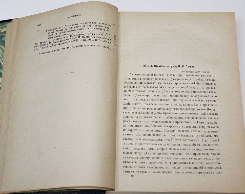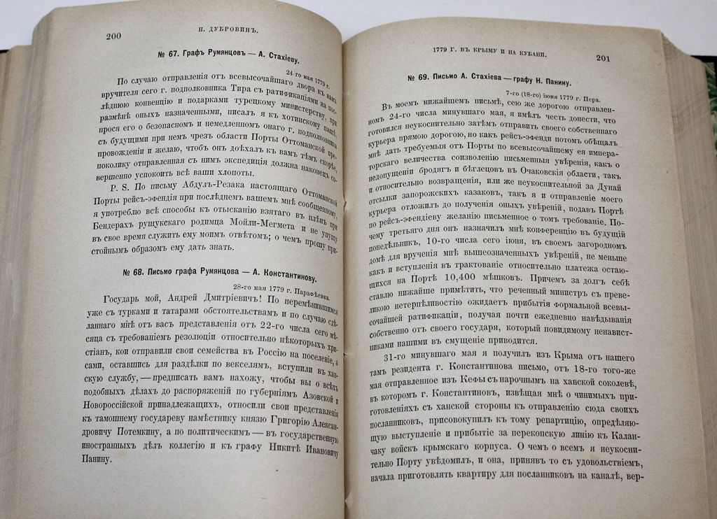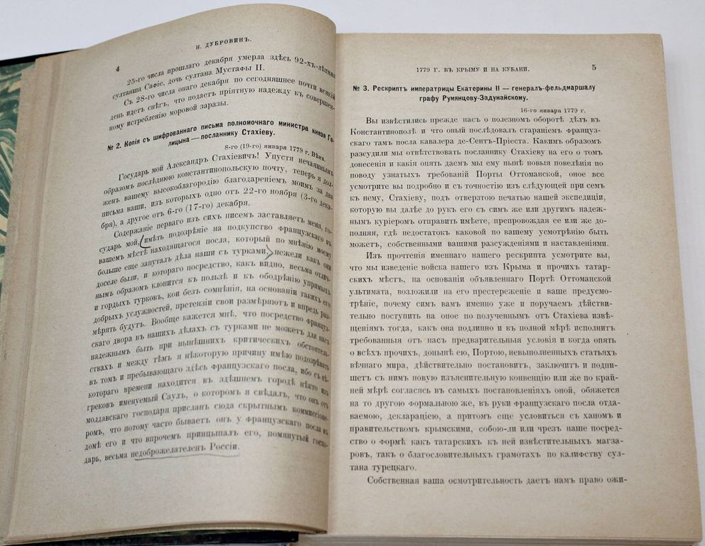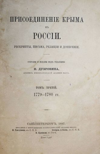Дубровин Н. Присоединение Крыма к России. Рескрипты, письма, реляции и донесения. [в 4 т.]. Том 3: 1779-1780 гг. СПб.: Тип. Имп. Акад. наук, 1887. – XXII, 739, [3] с. В современном полукожаном переплете. Увеличенный формат, 23х17 см. Фундаментальный труд русского историка Николая Фёдоровича Дубровина (1837–1904) представляет собой сборник документов, связанных с событиями, приведшими к присоединению Крыма к России. Дубровин рассматривает деятельность российских дипломатов и военачальников, освещает положение крымско-татарского общества, внутренние конфликты и борьбу за власть, а также роль Османской империи и европейских держав в судьбе Крымского ханства. Особое внимание уделено Русско-турецкой войне 1768–1774 гг., Кючук-Кайнарджийскому миру и процессу постепенного вхождения Крыма в состав России. Многие документы в этом сборнике были изданы впервые и впоследствии не переиздавались. Полный комплект на антикварном рынке практически не встречается. Редкость! Хорошее состояние. Владельческие карандашные пометки, `мытый` экземпляр.