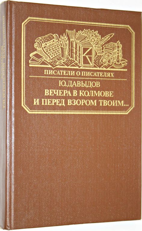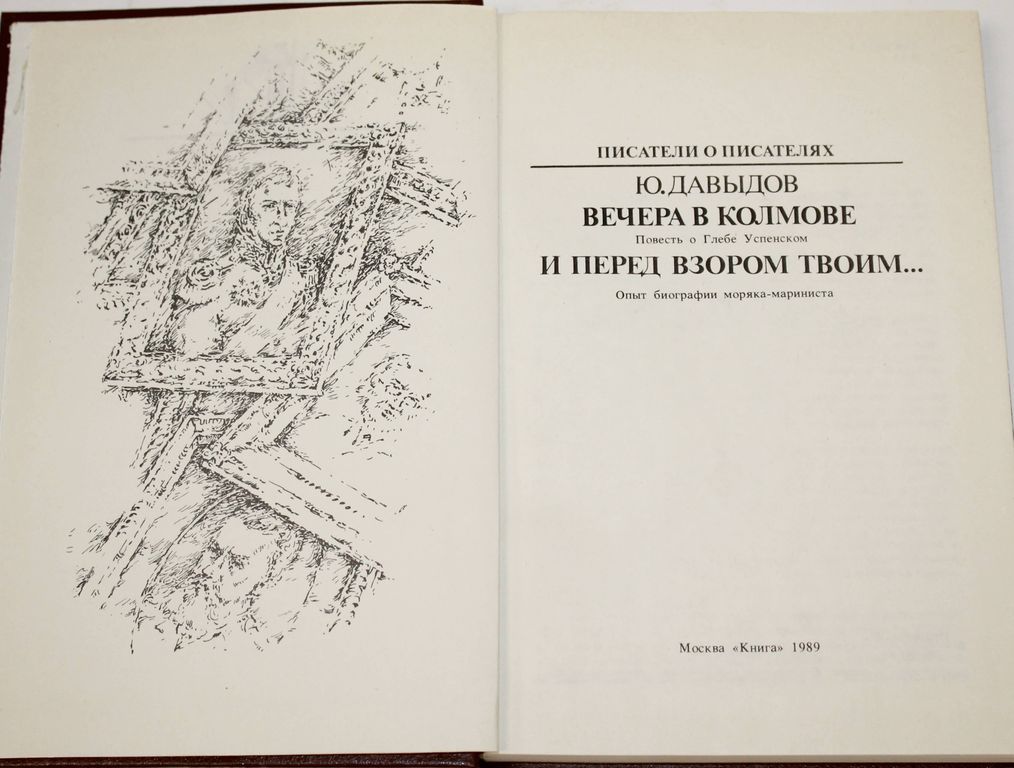 Давыдов Ю.В. Вечера в Колмове. Повесть о Глебе Успенском. И перед взором твоим… Опыт биографии моряка-мариниста. Серия: Писатели о писателях. М.: Книга. 1989г. 334 с., ил. Повесть о Глебе Успенском рассказывает о последних, самых драматических годах жизни замечательного русского писателя. Написанная ярко, страстно, повесть заставляет сегодняшнего читателя обратиться к нравственным проблемам, связанным с судьбой народа. В книгу включены повесть о русском мореплавателе и писателе Василии Головнине, а также в сокращенном варианте ``Дневник Усольцева. Твердый переплет. Увеличенный формат. Отличное состояние.