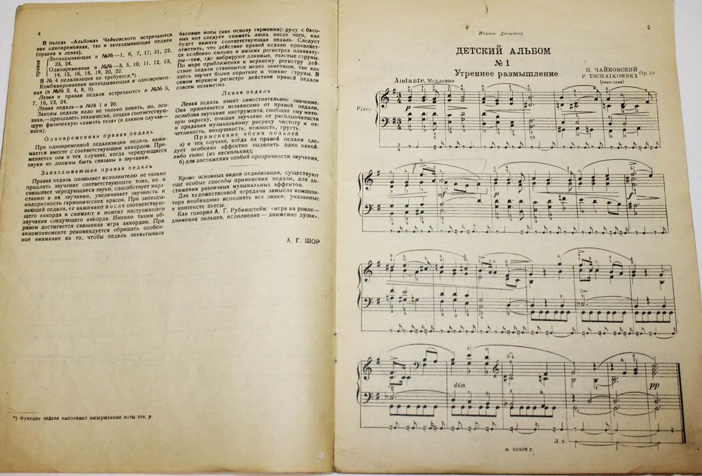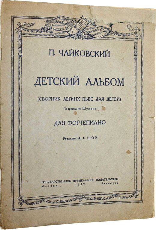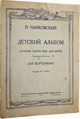 Чайковский П. Детский альбом (сборник пьес для детей). Подражание Шуману. Для фортепиано. Редакц. А.Г.Шор. М.-Л.: Музиздат, 1939. – 36 с., нот. Мягкая обложка. Энциклопедический формат, 30х21.5 см. `Детский альбом` П.И. Чайковского - первое произведение в истории русской музыки для детей и о жизни детей, об их мироощущении, миропонимании. В сборнике: Утреннее размышление; Зимнее утро; Игра в лошадки; Мама; Марш деревянных солдатиков; Болезнь куклы; Похороны куклы; Вальс; Новая кукла; Мазурка; Русская песня; Крестьянин на гармонике играет; Камаринская; Полька; Итальянская песенка; Старинная французская песенка; Немецкая песенка; Неаполитанская песенка; Нянина сказка; Баба-яга; Сладкая греза; Песня жаворонка; Шарманщик поет. Хорошее состояние. Реставрация обложки.