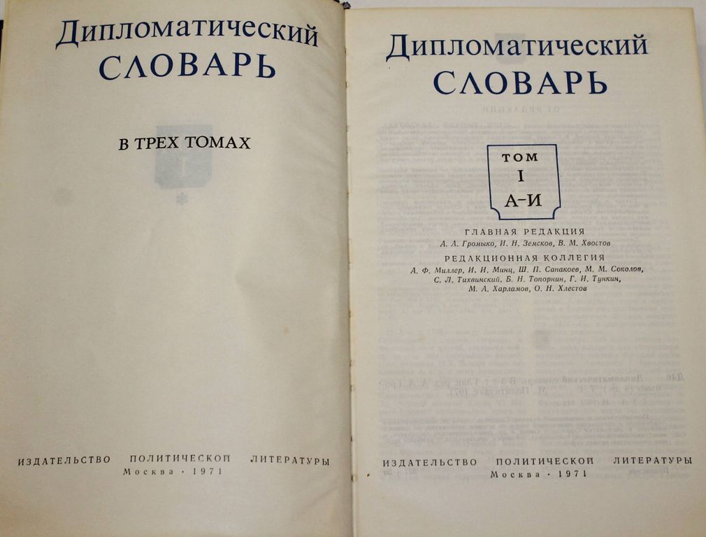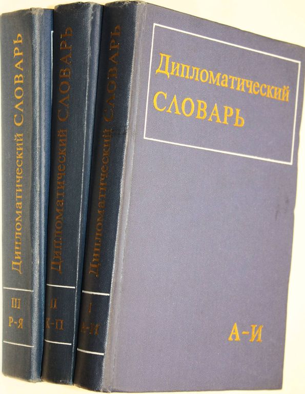 Дипломатический словарь в трех томах. Т.1-Т.3. Глав. Ред.А.А.Громыко. М.: Политиздат. 1971г. 612 с.+ 592 с.+ 719 с. Издание содержит статьи по международным отношениям и дипломатии совремнной эпохи,по истории дипломатии,по внешней политике и дипломатии Советского Союза и др.государств,о международных конгрессах,совещаниях,договорах,декларациях,о наиболее крупных дипломатах разных стран. Твердый переплет. Увеличенный формат. Хорошее состояние.