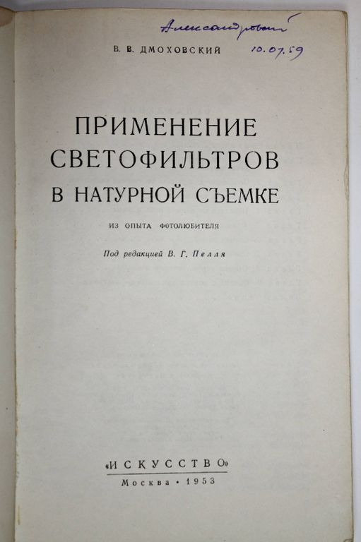Дмоховский В.В. Применение светофильтров в натуральной съемке. Из опыта фотолюбителя. М.: Искусство. 1953г. 96с.,24 фото. В настоящей книге рассматриваются природные условия и их влияние на выбор технических средств съемки. В процессе съемки приходится решать три основных технических вопроса: наводка на резкость, определение экспозиции и подбор светофильтров. Мы касаемся только последнего вопроса, причем основным критерием правильности выбора технических средств принимается соответствие впечатления от снимка впечатлению от натуры. Поэтому в первой главе рассматривается вопрос о том, что следует понимать под правдивостью и точностью фотографии. Исправлению светофильтрами передачи цвета посвящена вторая глава. В третьей мы разбираем влияние светофильтров на передачу светотени. Передаче воздушной перспективы посвящается четвертая глава. В остальных главах разбирается влияние светофильтров на передачу отдельных сюжетов: неба, воды, леса, зимних и горных пейзажей. Применению поляризационного светофильтра посвящена отдельная глава. В книге говорится как о технической, так и главным образом о художественной фотографии, то есть о таких снимках, впечатление от которых возможно точнее соответствует непосредственному восприятию сюжета. Книга содержит большое количество фотоиллюстраций. Мягкий переплет. Обычный формат. Хорошее состояние.