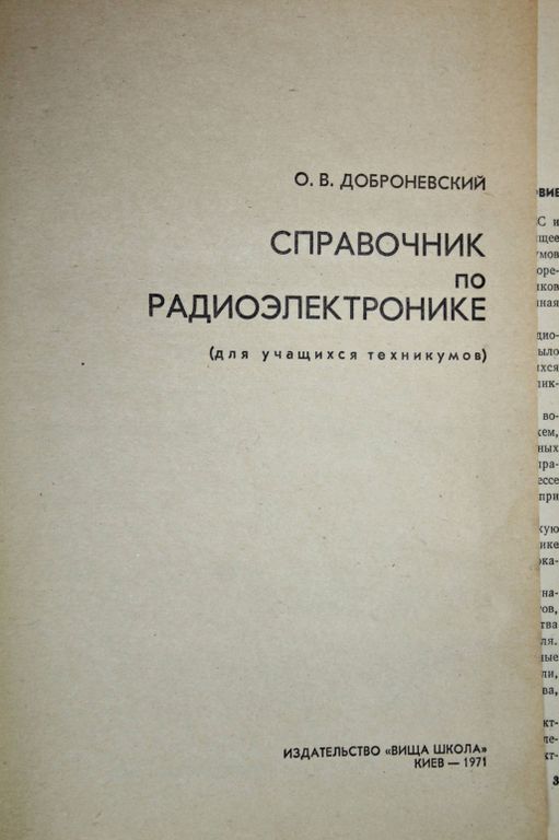 Доброневский О.В. Справочник по радиоэлектронике. Для учащихся техникумов. Киев: Вища школа. 1971г. 292с. Несмотря на большое количество имеющихся радиотехнических справочников, до настоящего времени не было справочного пособия по радиоэлектронике для учащихся техникумов. Эта книга призвана в какой-то степени ликвидировать имеющийся пробел. В справочнике достаточно подробно рассмотрены вопросы теории и расчета союзных радиотехнических схем, приведены справочные данные некоторых функциональных элементов радиоэлектронной аппаратуры. Поэтому справочник может быть использован учащимися как в процессе изучении теоретического учебного материала, так и при выполнении расчетно-практических работ. При отборе материала справочника были учтены наименования и содержание специальных учебных предметов, которые предусмотрены в учебных планах большинства специальностей техникумов радиотехнического профиля. К ним относятся основы радиотехники, электровакуумные и полупроводниковые приборы, электронные усилители, радиопередающие устройства, радиоприемные устройства, импульсная техника и телевидение. Твердый переплет. Увеличенный формат. Хорошее состояние.