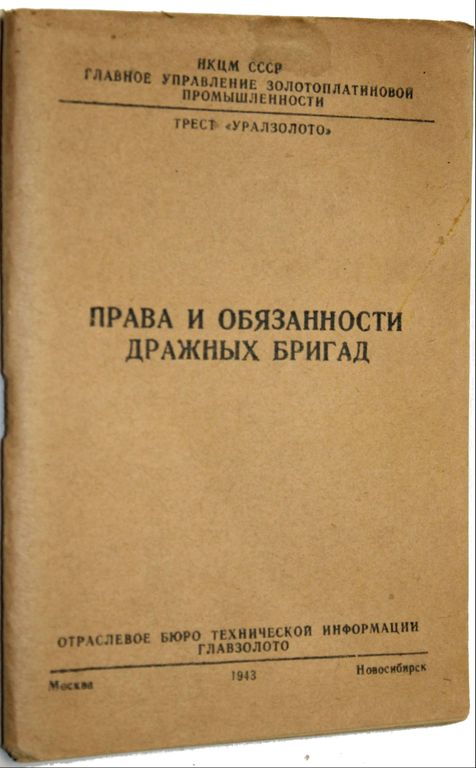 Права и обязанности дражных бригад. Составлено инженерами производственного отдела треста «Уралзолото» З.Н.Парицким и Б.Г.Сарапуловым. М.- Новосибирск: Отраслевое бюро технической информации главзолото, 1943. – 80, [2] с., ил. Мягкая издательская обложка. Уменьшенный формат, 16х11 см. Тираж 1600 экз. Хорошее состояние.