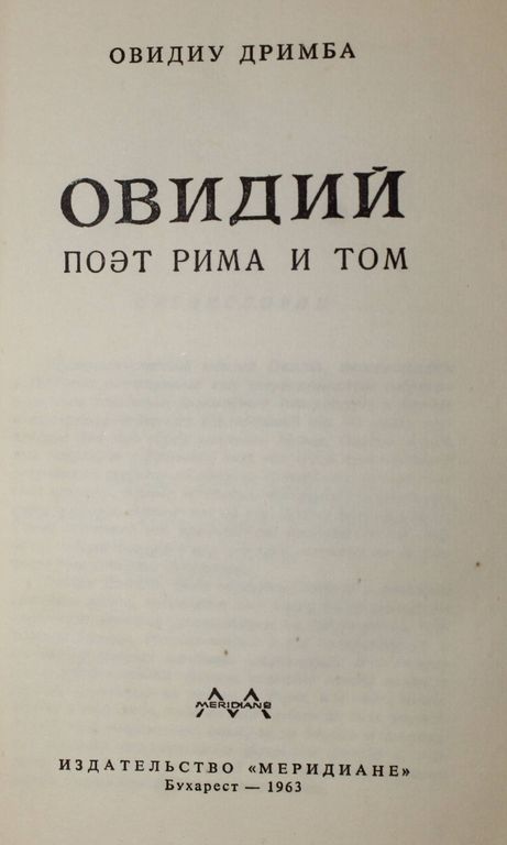 Дримба О. Овидий. Поэт Рима и Том. Бухарест: Меридиане. 1963г. 292с. + карта. Рисуя облик Овидия на фоне широкой картины эпохи и рассматривая его произведения как фрагменты духовной автобиографии поэта, автор настоящей работы в строгом, изящном и увлекательном стиле, ни на минуту не прибегая к дешевым вымыслам, создает живой, сложный и цельный образ Публия Овидия Назона. Твердый переплет. Суперобложка. Обычный формат. Хорошее состояние, супер. с потерт. и надрыв. Влад. пометки.