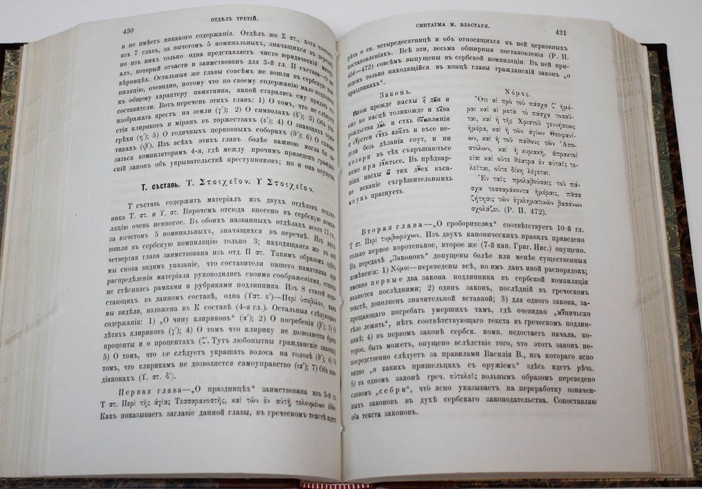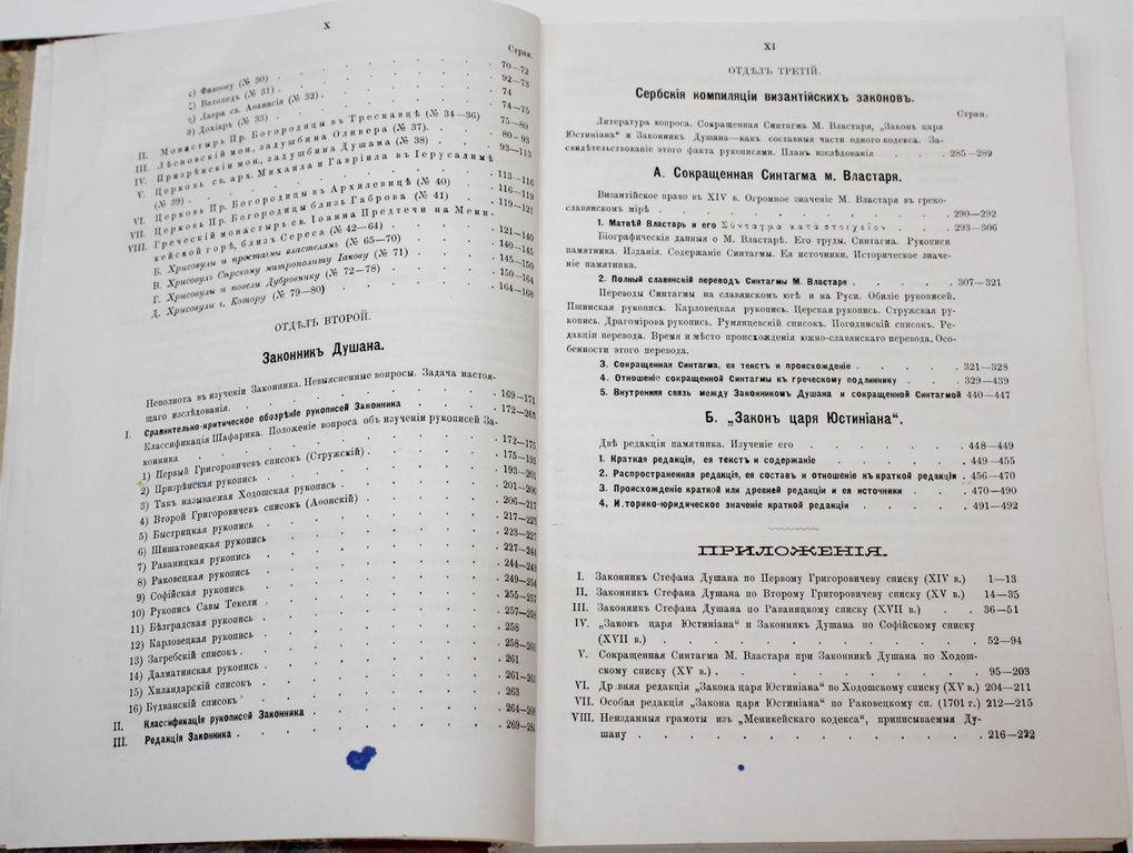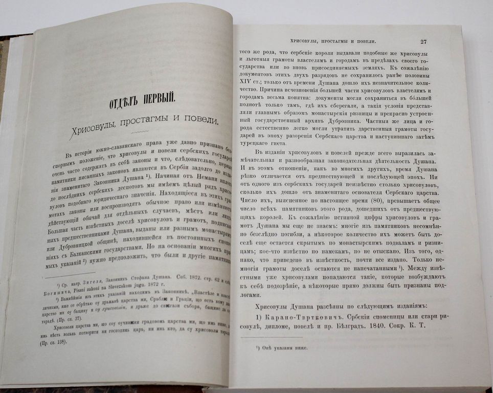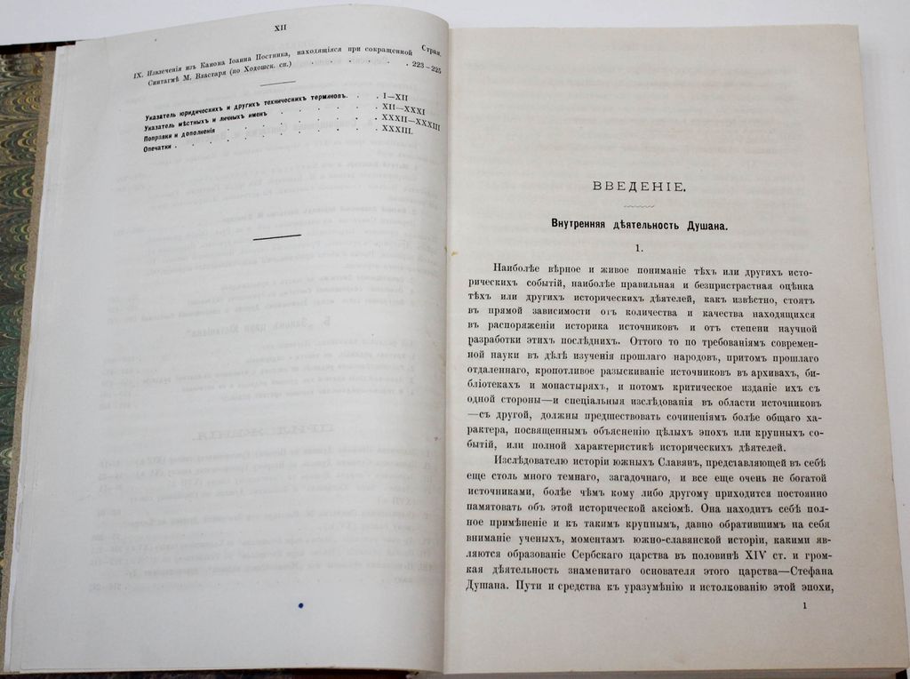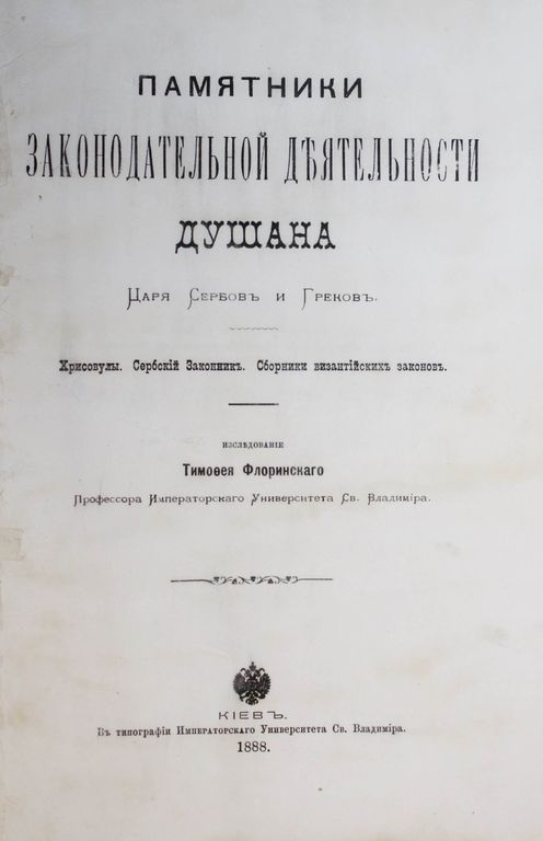 Флоринский Т. Памятники законодательной деятельности Душана, царя сербов и греков. Хрисовулы. Сербский Законник. Сборники византийских законов. Киев: Типо-лит. унив-та Св.Владимира, 1888. – XII, 491, [5], 226, XXXIV с., 2 л. факс. В современном полукожаном переплете. Энциклопедический формат, 24х18 см. Тимофей Дмитриевич Флоринский (1854-1919) - русский филолог-славист, историк, византинист, политический деятель, член-корреспондент Императорской академии наук. В данной монографии на основе анализа древних рукописей автор осветил внутреннюю политику сербского правителя XIV в. Стефана Душана (ок. 1308-1355), охарактеризовал хрисовулы и новеллы сербских государей, дал классификацию рукописей Законника Стефана Душана, проанализировал сербские компиляции византийских законов. Хорошее состояние. `Мытый` экземпляр.