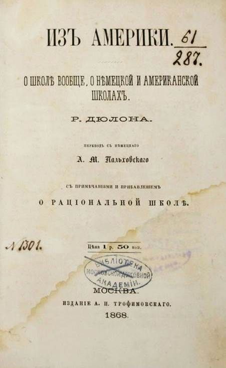 Дюлон Р. Из Америки. О школе вообще, о немецкой и американской школах. С примечаниями и прибавлением о рациональной школе. Пер. с нем. А.М.Пальховского. М.: Издание А.Н.Трофимовского, 1868. – XVI, 304 с. Владельческий полукожаный переплет. Обычный формат, 21х14 см. Рудольф Дюлон (1807 - 1870) - немецким теолог, педагог и демократический революционер. В 1855 году купил школу Фельднера в Нью-Йорке, которая стала первой немецко-американской школой в США. Книга Дюлона представляет собой свод его наблюдений, идей и предположений касательно вопроса о воспитании. Прижизненное издание. Редка. Хорошее состояние. Небольшая потертость переплета, дореволюционные штампы и отметки `Московской духовной академии`.