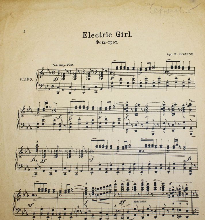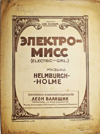 Электро – мисс (electric-girl). Фокс-трот. Музыка Helmburcch-Holme. Л.: Изд. Леон. Валящик, 192?. – 4 с., нот. Мягкая обложка. Очень большой формат, 34.5х25.5 см. Фокстрот (англ. fox-trot, от fox – лиса и trot – быстрый шаг) - парный танец, связанный с регтаймом. Зародился в 1910-е годы в США. Получил широкое распространение в странах Европы после Первой мировой войны, особенно в 1920–30-е годы. Тираж 300 экз. Хорошее состояние. Небольшие загрязнения, штамп магазина, владельческая подпись.