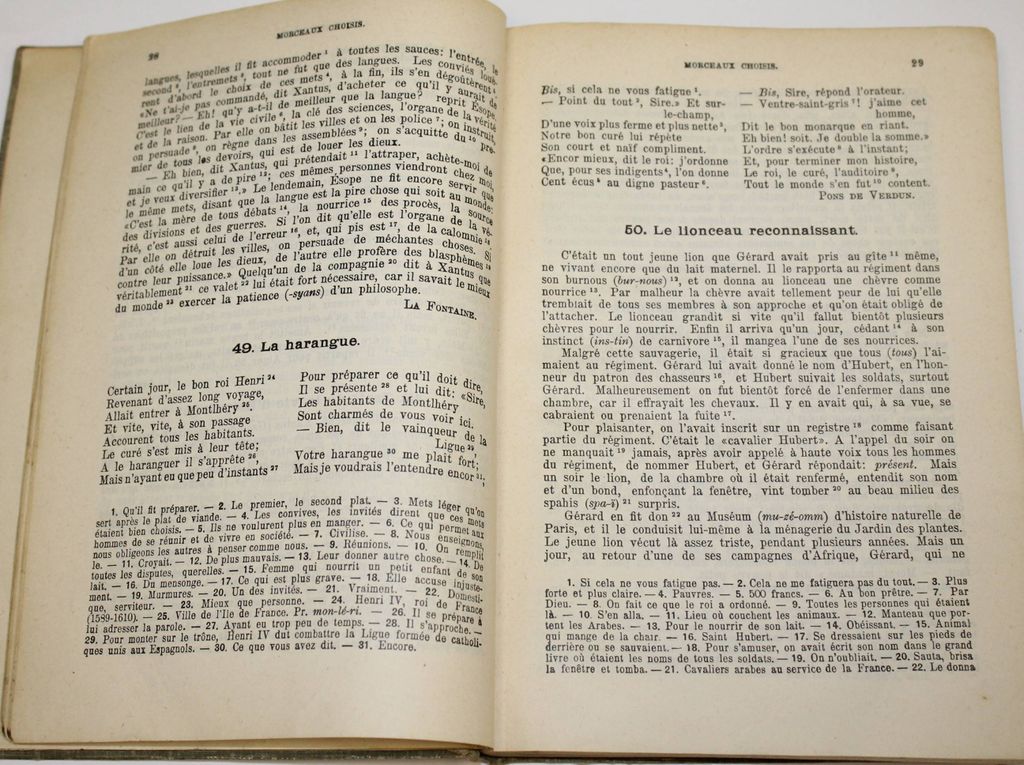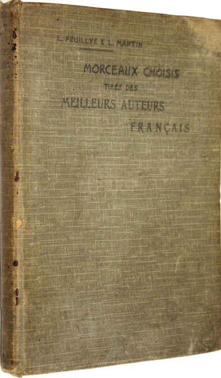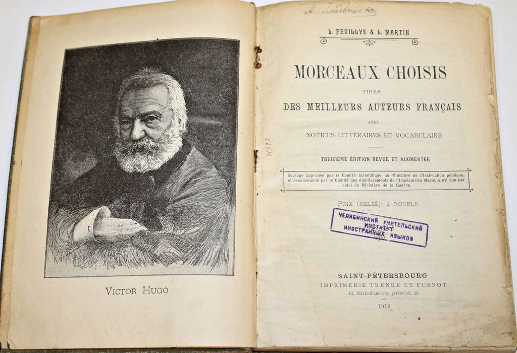 Feullye L., Martin L. Morceaux choisis tires des meilleurs auteurs Francais. Избранные отрывки, извлеченные из лучших французских авторов. СПб.: Imprimerie trenke et fusnot, 1912. – VIII, 274, 92, [2] с., ил. Твердый переплет. Увеличенный формат. Издание с портретом Виктора Гюго. В книгу на французском языке вошли отрывки избранных произведений лучших писателей Франции, таких как Беранже, Дюма, Гюго, Мэримэ, Стендаль, Вольтер, Золя и др. В приложении дан французско-русский словарь. Удовлетворительный формат.