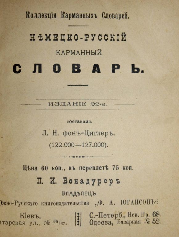 Фон-Циглер Л.Н. Немецко-русский карманный словарь. Изд. 22-е. Киев: П.И.Бонадурер, владелец Южно-русского книгоиздательства `Ф.А.Иогансон`, 1914. – [4], 700 с. Коленкоровый переплет. Уменьшенный формат, 11.5х9.5 см. Хорошее состояние. Небольшая потертость переплета, передний форзац подклеен бумагой.