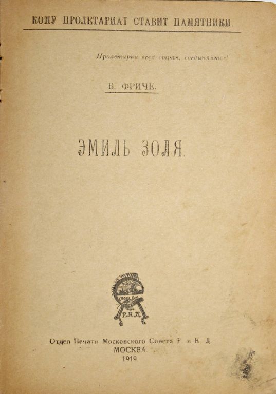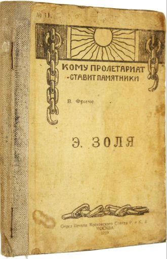 Фриче В. Эмиль Золя (Кому пролетариат ставит памятники). М.: Отдел Печати Московского Совета Р. и К.Д., 1919. – 47 с. Издательский картонажный переплет. Обычный формат, 17х12.5 см. Владимир Максимович Фриче (1870-1929) - российский и советский литературовед и искусствовед, академик АН СССР. Романы Золя в России были очень популярны и носили функцию агитационного материала. Хорошее состояние. Утрата последнего листа.