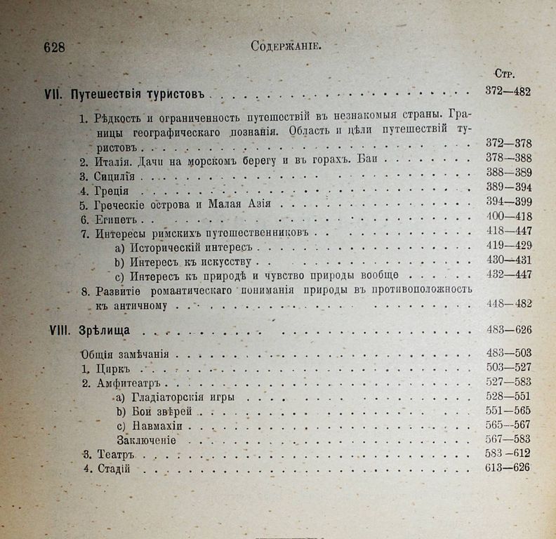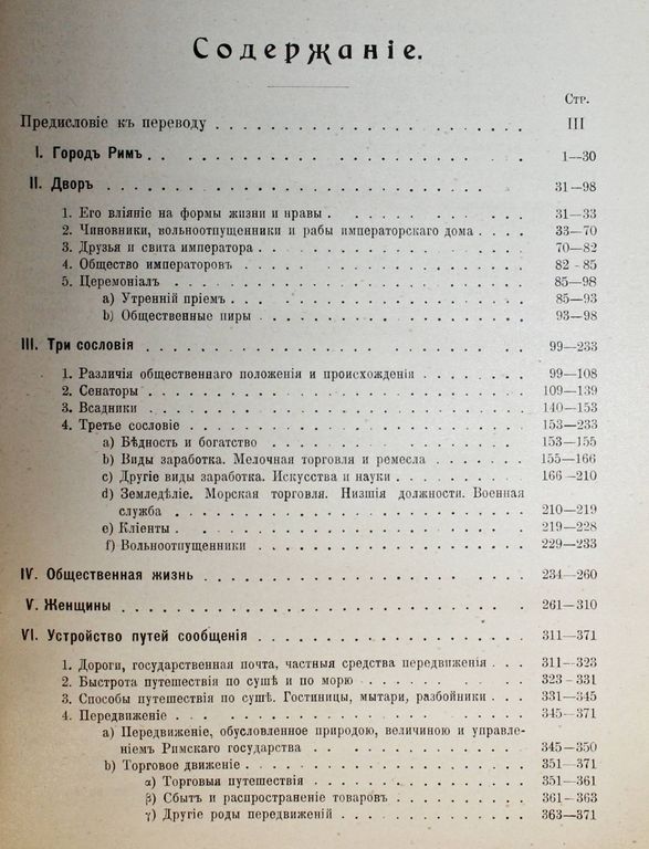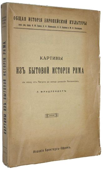 Фридлендер Л. Картины бытовой истории Рима в эпоху от Августа до конца династии Антонинов. Часть 1. Общая история Европейской культуры. Под ред. И.М.Гревса, Ф.Ф.Зелинского, Н.И.Карева и М.М.Ростовцева. Том IV. СПб.: Брокгауз-Ефрон, 1914. – IV, 628 с. В шрифтовой издательской обложке. Энциклопедический формат, 28х18 см. Людвиг Фридлендер (1824 – 1909) - немецкий филолог и археолог, профессор кенигсбергского, затем страсбургского университетов. Его ученые исследования и работы касаются главным образом критики гомеровских поэм и изображения античной, преимущественно древнеримской жизни. О г л а в л е н и е: - Город Рим; - Двор (церемониал, общество императоров, свита, чиновники, вольноотпущенные и рабы императорского дома); - Три сословия: сенаторы, всадники, третье сословие; - Общественная жизнь; - Женщины; - Устройство путей сообщения; - Путешествия туристов (Италия, Сицилия, Греция, Малая Азия, Египет); - Зрелища: цирк, амфитеатр, театр, стадий. Хорошее состояние. Необрезанный экземпляр.
