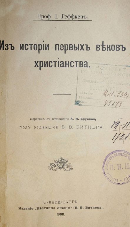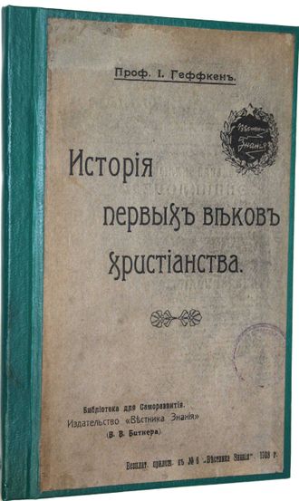 Геффкен И. Из истории первых веков христианства. Пер. с нем. А.Я.Брусова. Под ред. В.В.Брикнера. СПб.: `Вестник Знания`, 1908. – 86, [2] с. Твердый владельческий переплет. Передняя издательская обложка наклеена на верхнюю крышку, задняя – сохранена в переплете. Увеличенный формат, 24.5х15.5 см. Карл Генрих Йоханнес Геффкен (1861 - 1935) - немецкий филолог-классик, работал профессором в Ростокском университете с 1907 по 1933 гг. Исследователь позднеантичной философии и религии. Автор таких исследований, как `Композиция и время возникновения Сивиллиных оракулов` и `Платон и Восток`. Хорошее состояние. `Мытые` и дореволюционные штампы.