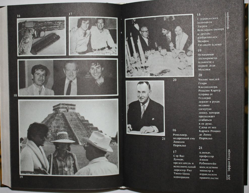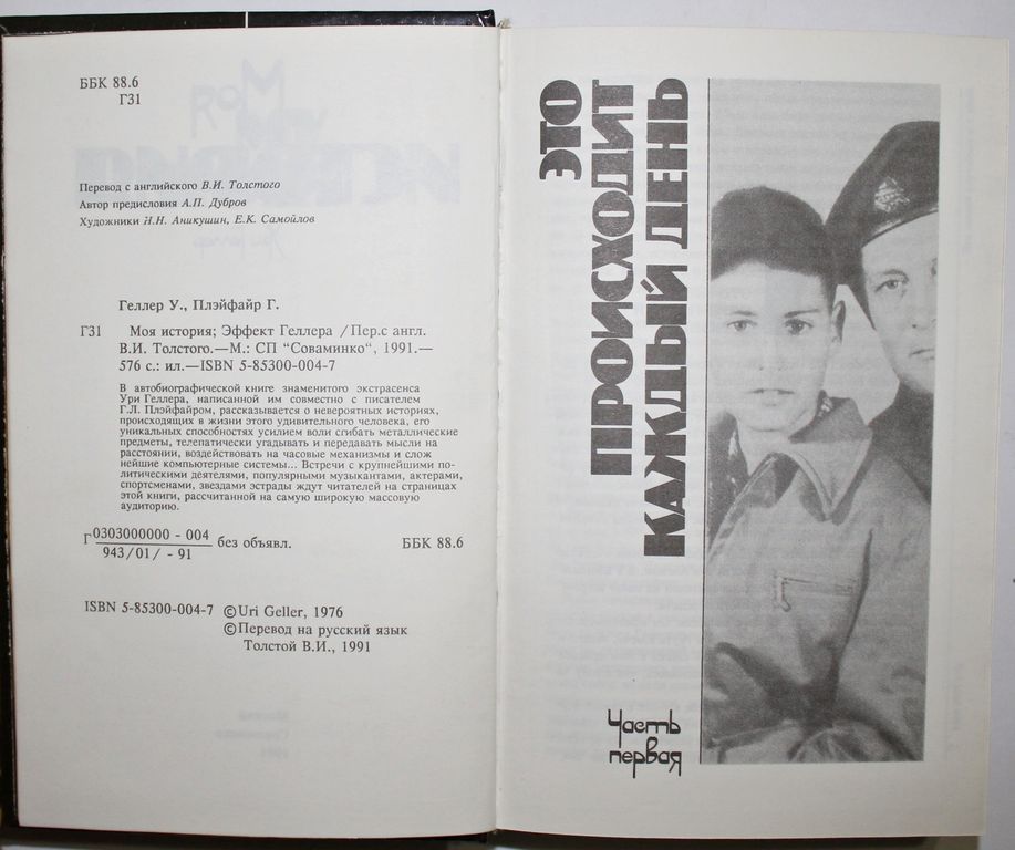 Геллер У., Плэйфайр Г. Моя история; Эффект Геллера. Пер. с англ. В.И.Толстого. М.: СП `Соваминко`, 1991. – 576 с., ил. Твердый издательский переплет. Аллигат. Обычный формат, 20.5х13.5 см. В автобиографической книге знаменитого экстрасенса Ури Гиллера, написанной им совместно с писателем Г.Л. Плэйфайром, рассказывается о невероятных историях, происходящих в жизни этого удивительного человека, его уникальных способностях усилием воли сгибать металлические предметы, телепатически угадывать и передавать мысли на расстоянии, воздействовать на часовые механизмы и сложнейшие компьютерные системы…. Встречи с крупнейшими политическими деятелями, популярными музыкантами, актерами, спортсменами, звездами эстрады ждут читателей на страницах этой книги, рассчитанной на самую широкую массовую аудиторию. Отличное состояние.