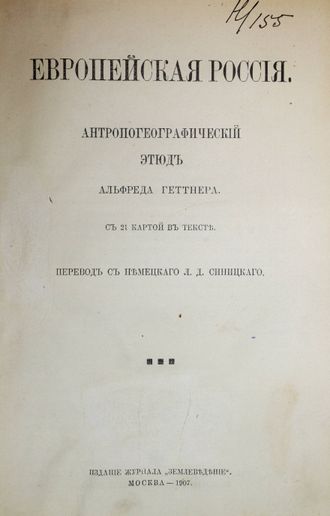 Геттнер Альфред. Европейская Россия. Антропологический этюд. С 21 картой в тексте. Пер. нем. Л.Д.Синицкого. М.: Изд. журнала `Землеведение`, 1907. – VIII, 174 с., ил. В составном переплете эпохи. Увеличенный формат, 23х15.5 см. Альфред Геттнер (1859 - 1941) - немецкий географ, крупнейший методолог географии, один из создателей хорологической концепции. Целью настоящего этюда является выяснение географических факторов, обусловливающих своеобразие русского народа, русского государства, русской культуры, а вместе с тем установление оснований для той справедливой оценки, которая приводит не к похвале или осуждению, а к пониманию. Хорошее состояние. Несколько мытых штампов.