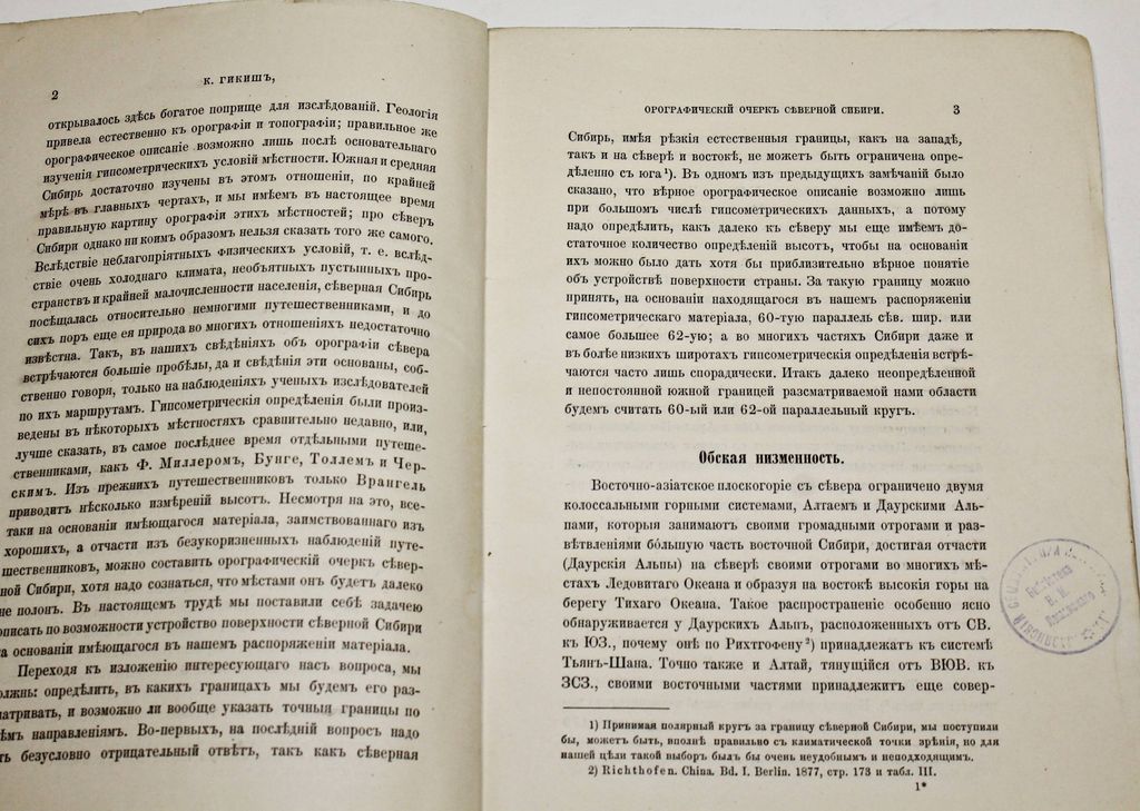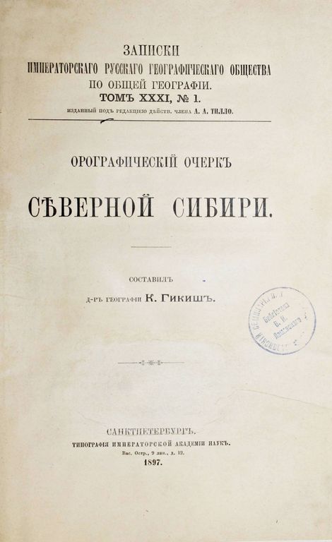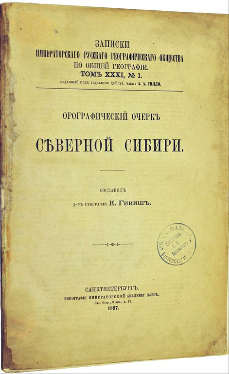Гикиш К. Орографический очерк северной Сибири. Записки Императорского Русского географического общества по общей географии. Том XXXI, №1. СПб.: Тип. Императорской Академии наук, 1897. – [2], 62, [2] с. В мягкой издательской обложке. Энциклопедический формат, 25х17 см. Из библиотеки Владимира Ивановича Ламанского (1833-1914) - выдающийся славист, филолог и историк, археограф и этнограф. После его смерти библиотека (около 10 тысяч томов) по завещанию покойного была передана славянскому семинарию Историко-филологического факультета Петроградского университета. Хорошее состояние. Сведение штампов, экслибрисы `Библиотека В.И.Ламанского`.