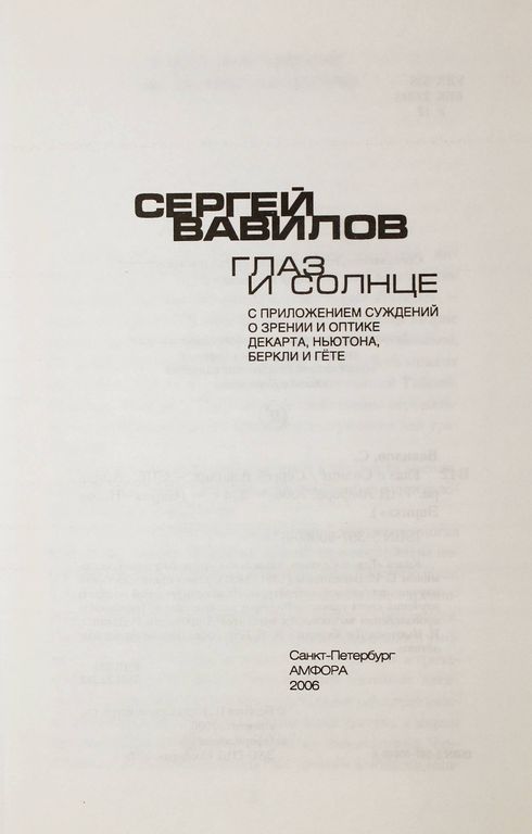 Вавилов С.И. Глаз и Солнце. Серия: Новая Эврика. СПб.: Амфора. 2006г. 336с. Книга Глаз и Солнце, написанная крупным ученым, академиком С.И.Вавиловым (1891-1951), давно стала классикой научно-популярной литературы. Изложенную в ней историю излучения света удачно дополняют включенные в Приложение произведения выдающихся мыслителей прошлого: Р.Декарта, И.Ньютона, Дж.Беркли и И.-В. Гете, посвященные проблемам оптики. Твердый переплет. Обычный формат. Отличное состояние.
